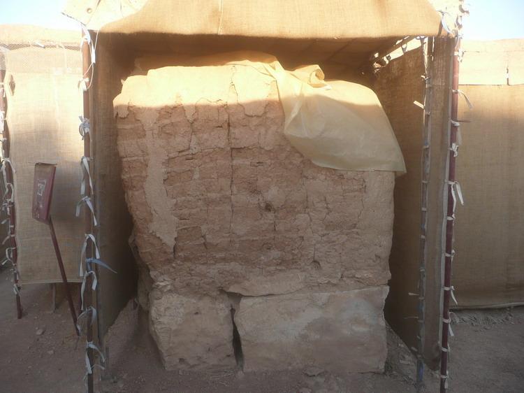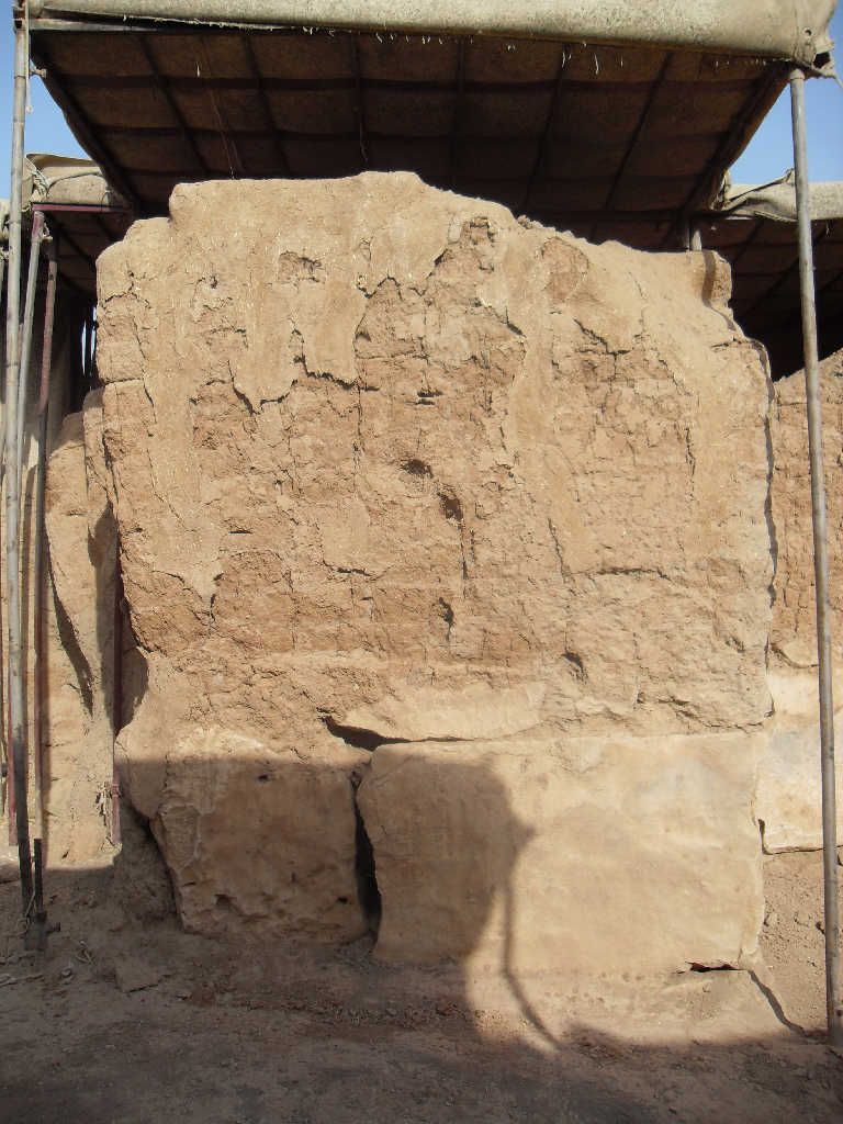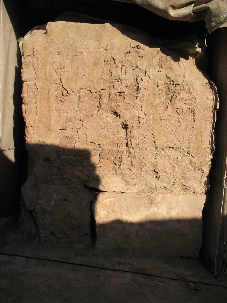 The mud plaster has peeled, there are cracks which may cause crumbling in the right side of the wall, the cracks seem wider than they were, no loss in mud bricks or mortar.