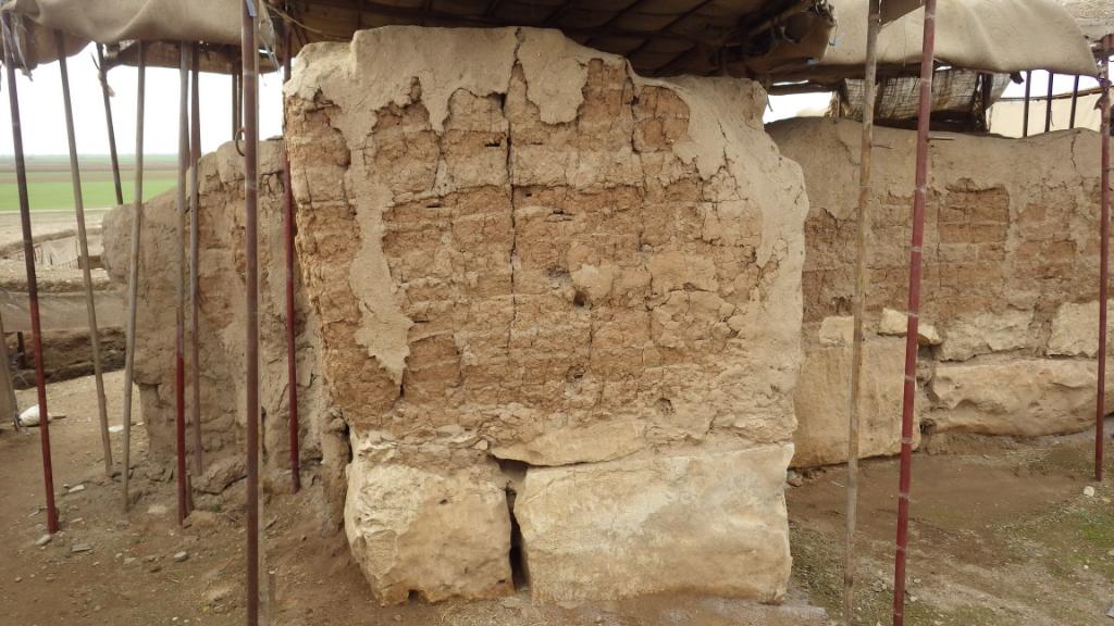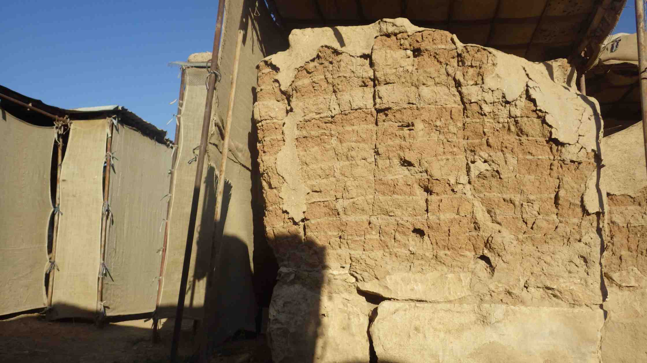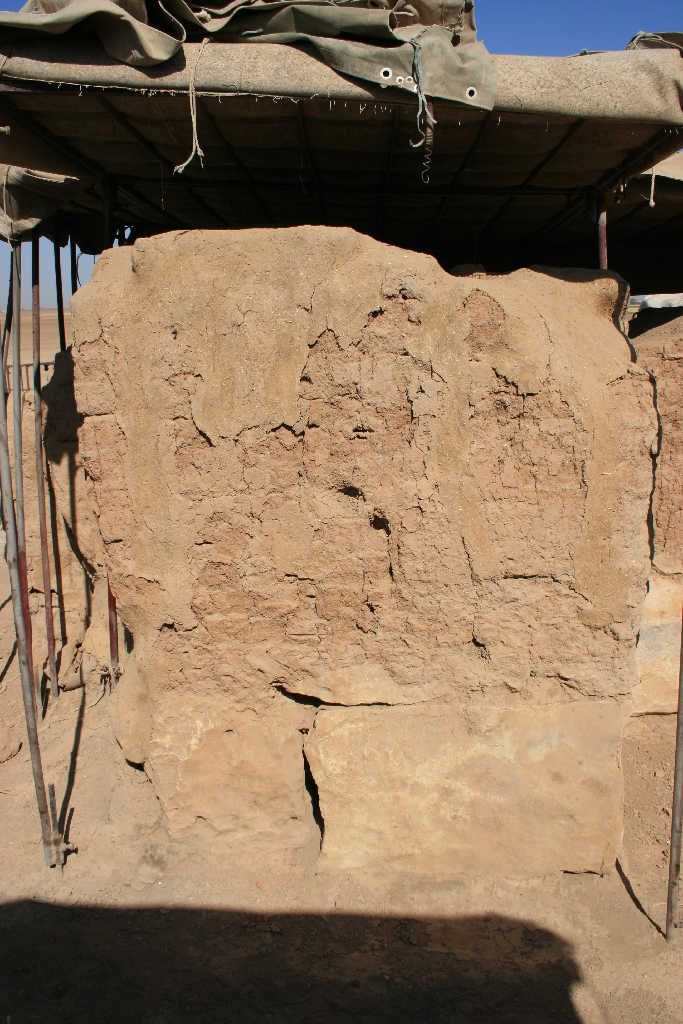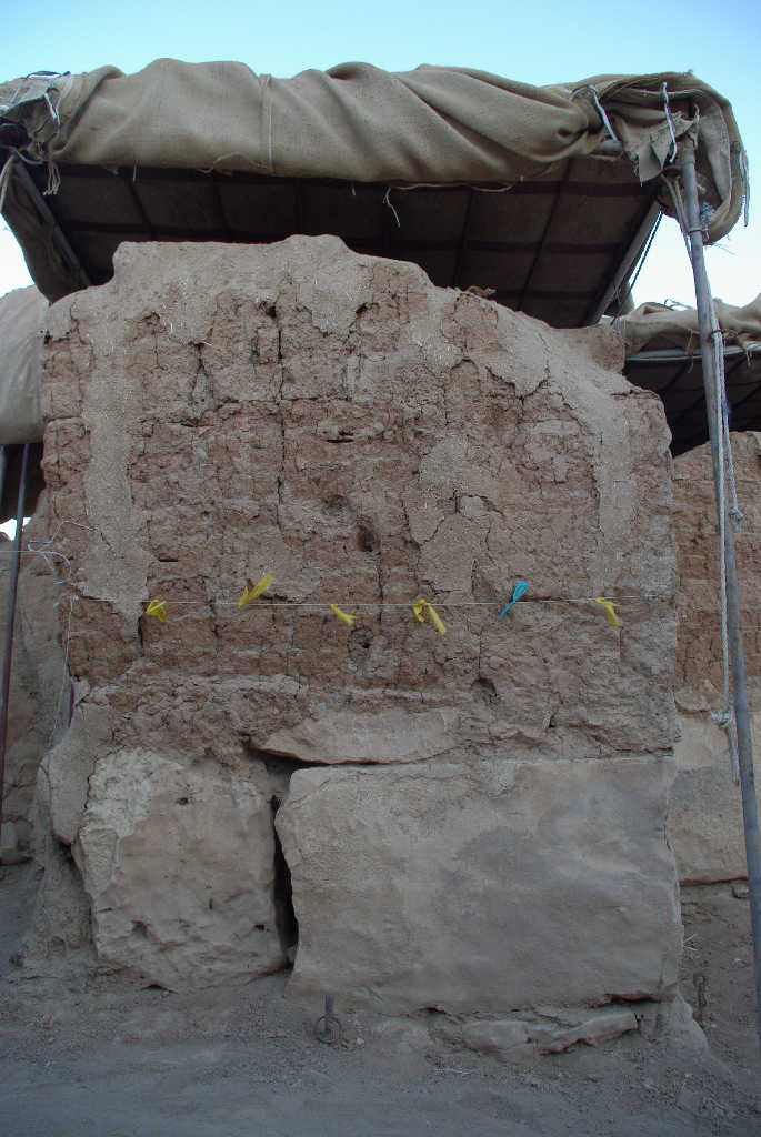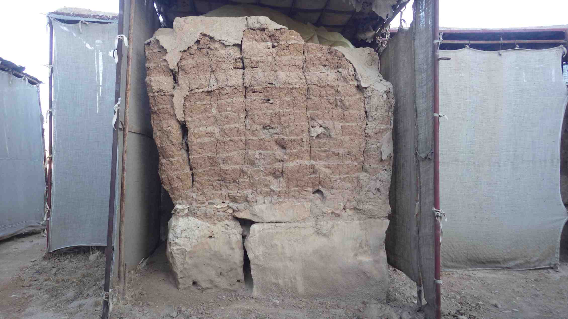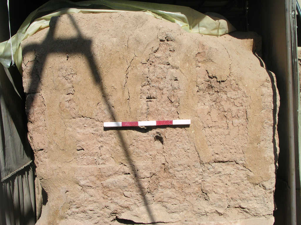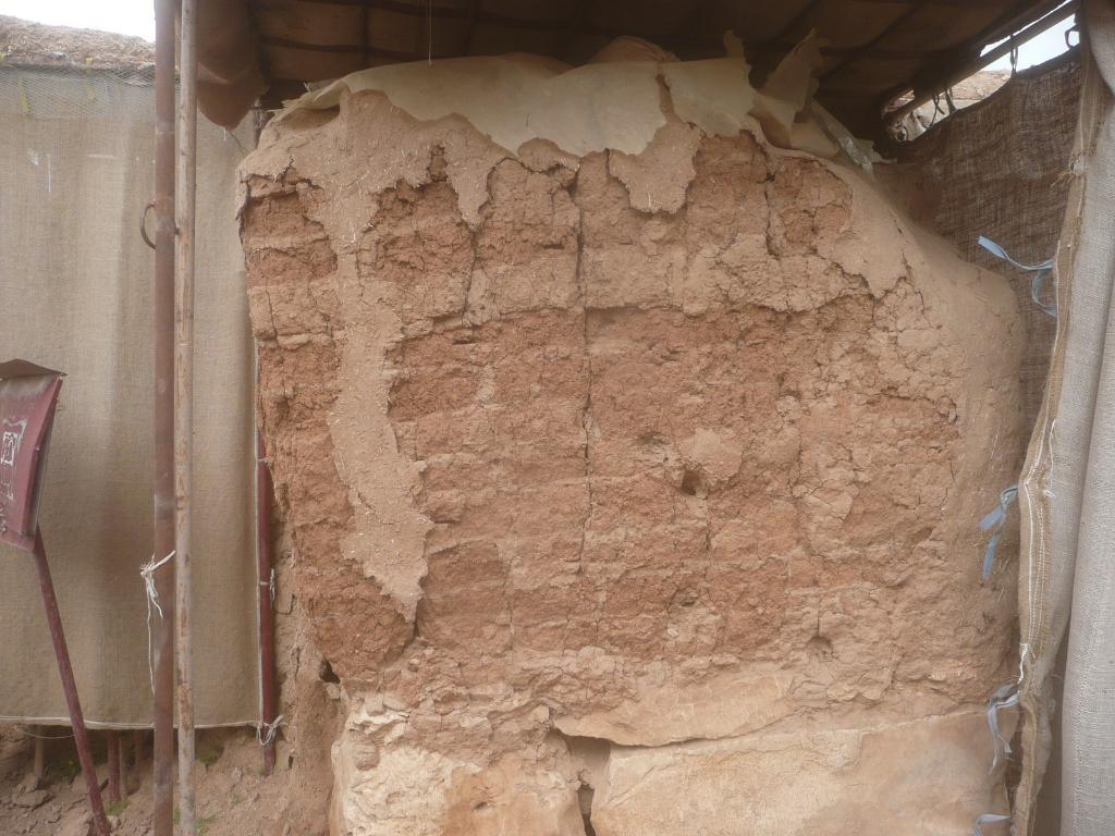 Face of the wall is dry and the mud plaster layer seems to be peeling and some portions did fall off, but nothing serious that would affect the integrity of the wall.