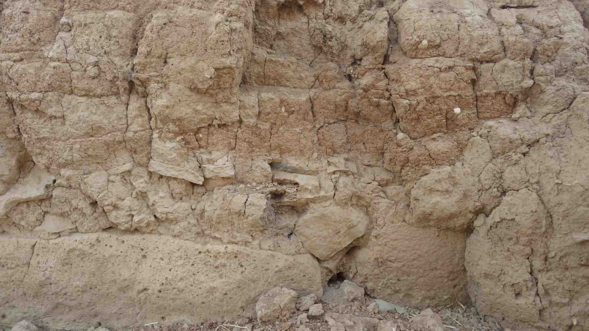 Wall appears dry and crumbly, the wall eroded in both left and right sides of the mud-brick part and lost parts of the mud bricks and the mud plaster. A trace of seeping water is clear in the middle of the wall.