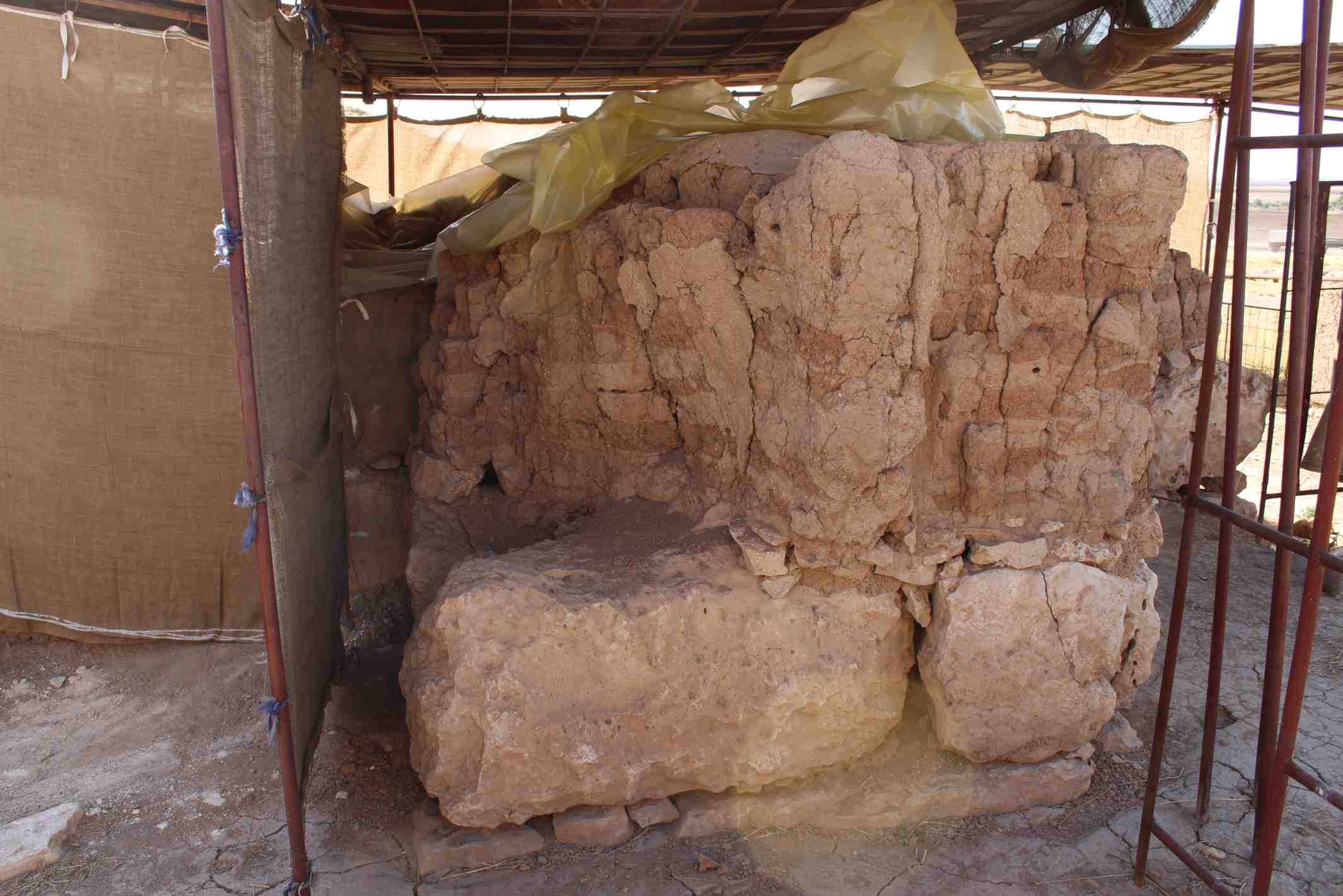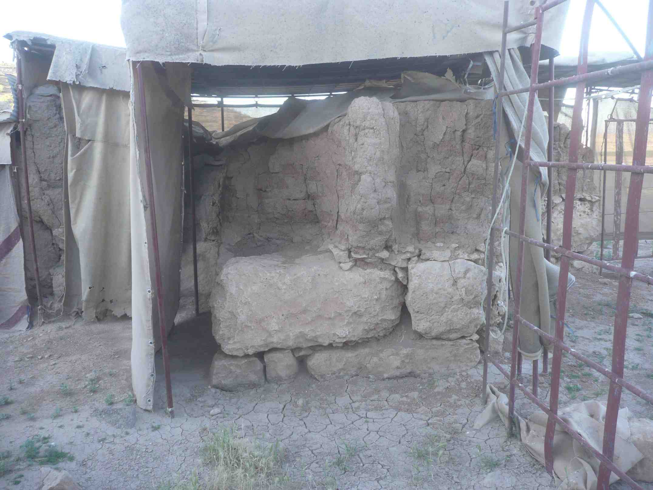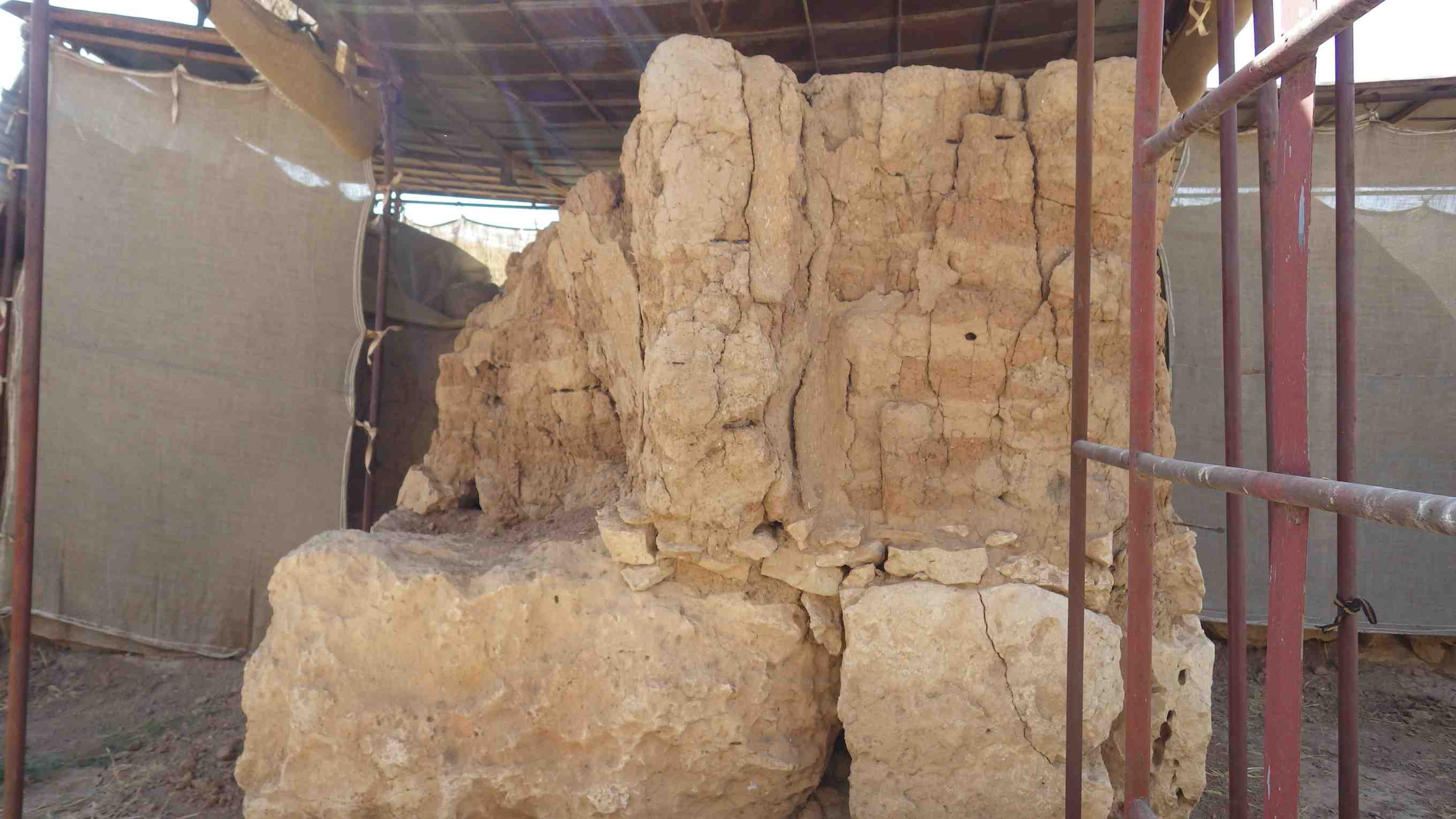 No losses in the stones or the mud bricks. There are cracks on the top, as for the left side, it is slightly eroded. The mud plaster has been eroded, and small parts of the plaster were lost.