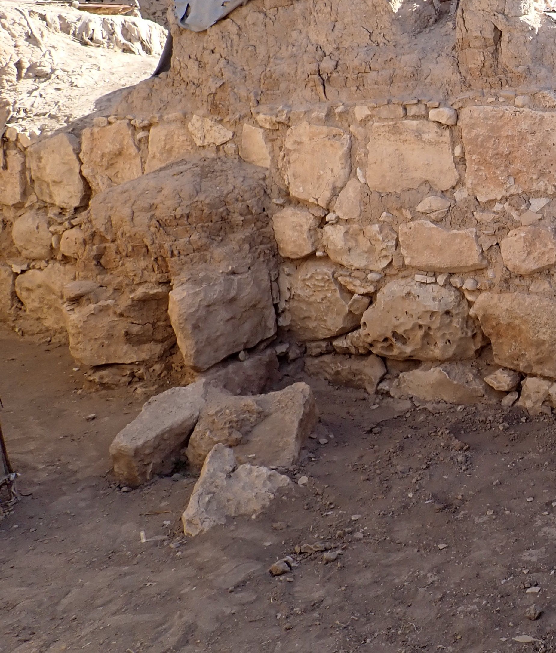 The wall seems fragile but no loss in mud bricks and the stones are in good shape, however, some cracks have appeared. Photo is not suitable for comparison.