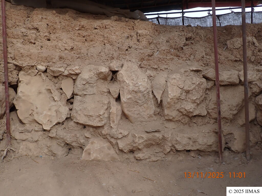 No loss of stones or mud bricks has been observed. The mud-brick section appears dry and fragile, with very minor erosion and limited traces of water dripping from the protective system at the upper right corner. Nevertheless, the wall remains in good overall condition.
