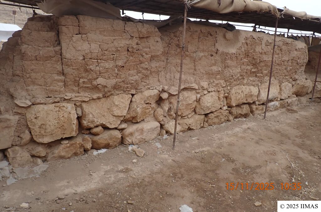 A slight loss of mud brick was observed in the middle of the mud-brick section. No noticeable widening of cracks was observed compared to the previous year. In addition, one small stone used as mortar between the larger stones in the wall foundation has been lost.