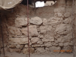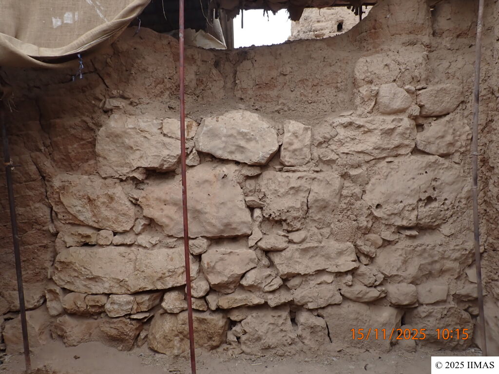 There is slight loss of mud bricks on the right side of the mud-brick section. The stone foundation remains in good condition, with no loss of stones. Overall, the wall remains in good condition.