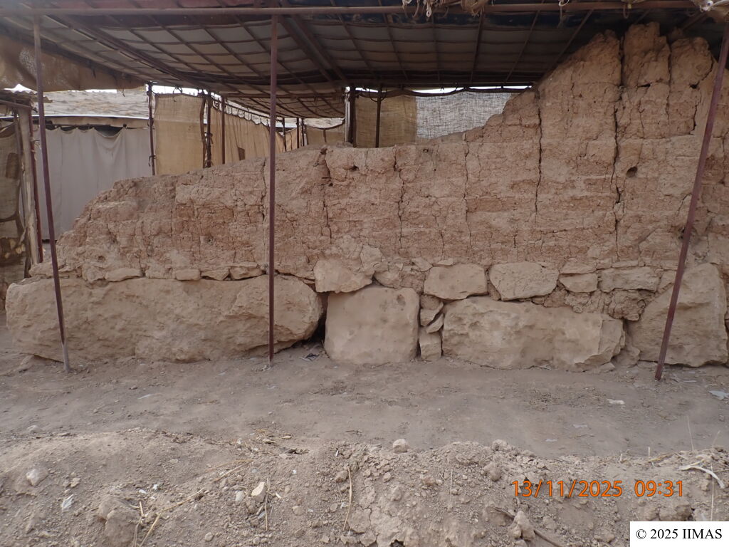 Minor erosion of mud bricks in the central part and the right-side portion are still present. Despite The presence of some cracks, the wall is in a stable condition. The large crack in the center appears to be wider this year. (May 2020, Y. Mahmoud)