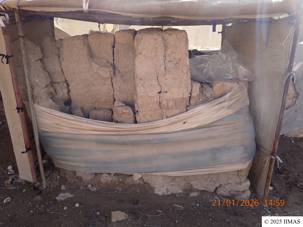 The wrapping of the wall has been torn, and we can clearly see that the top part of the mudbrick layer has eroded. Some damages appear on the surface of the face of the wall as well.