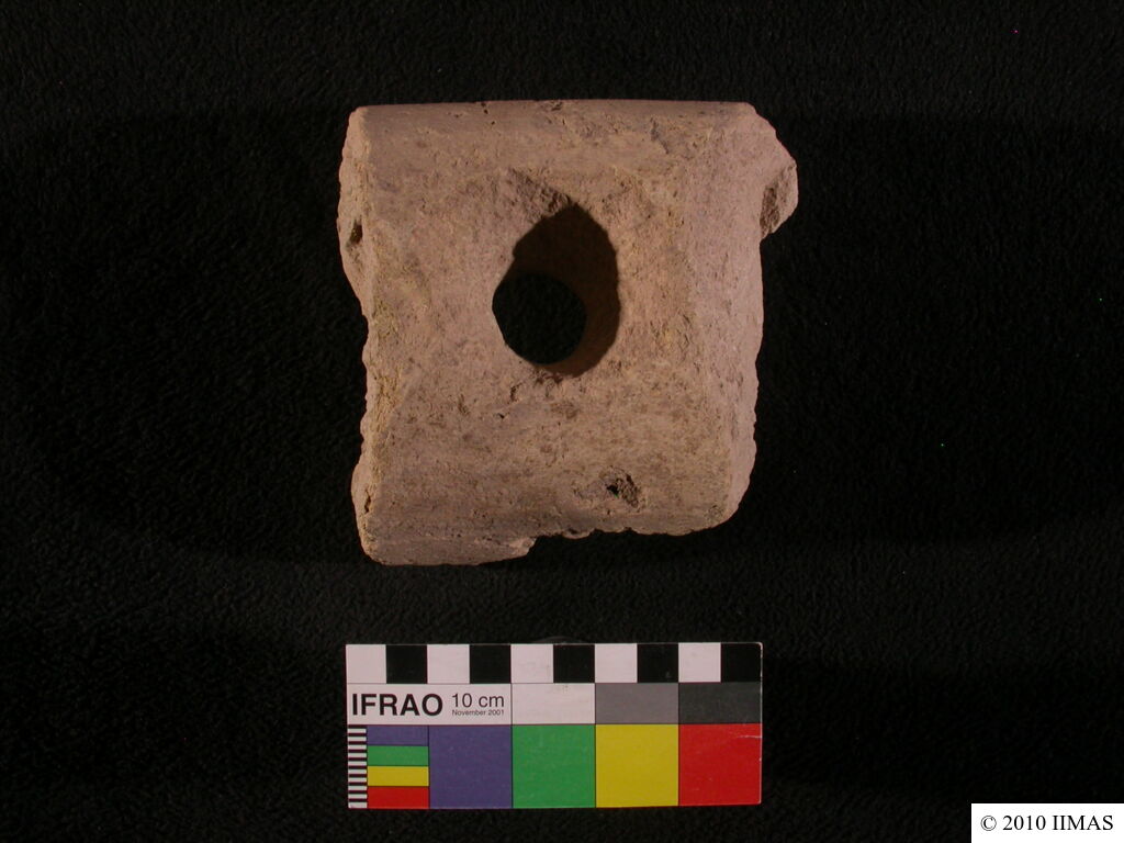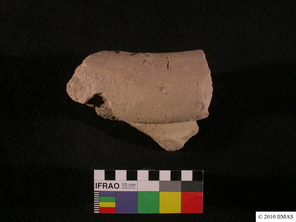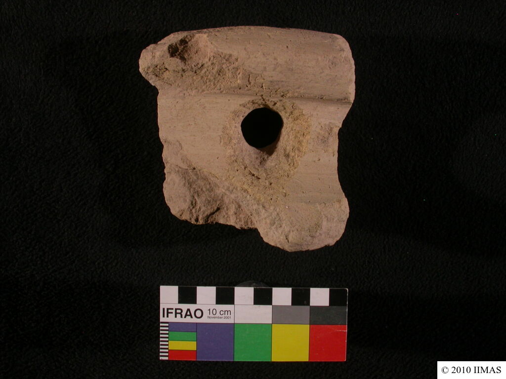 | Description (summary) | 2010-08-24 | jS | Fragment of an unknown clay object. One end looks like a huge rim of a vessel. After following a curve, the object is broken at the other end. In the middle, there is a big drilling. The surface is rough, chaff temper is visible. [Input: U824JS.j] |