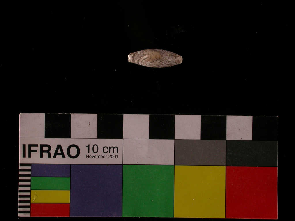 Cylindrical frit bead, pierced lengthwise, tapering strongly toward ends, both ends slightly chipped around hole. Pattern of alternating black and white lines forming a loose zigzag design. Black lines greatly faded, surface mottled with brown and black spots. [Input: R818SG.j] |