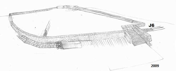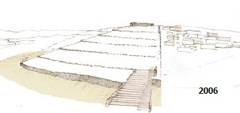 | These conclusions set the stage for a wider operation, the one that started in 2008 as J6. Originally aimed at exploring the area south of J4, it became apparent that the continuity to gthe north, along the staircase and thus across J4, constituted an organic whole that was best excavated as a unit. Hence J6 came to subsume J4. The skletch shows the reconstruction of the Temple Terrace after two seasons' work in the new unit. | ![]() |