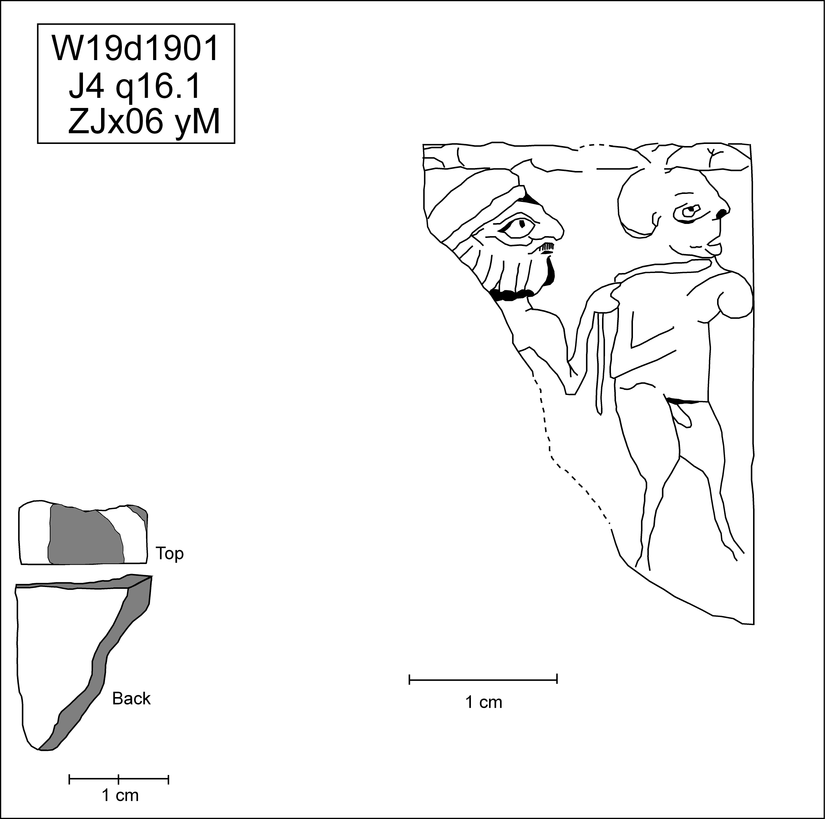 two evenly spaced figures, a soldier on the left and a naked prisoner on the right. The head of the soldier is shown in profile facing right. He is wearing a head band but his hair above is not clear. The beard is shown as short thickened strands with the hint of curls at the bottom. His left shoulder is represented in front view with his arm is rendered as wide near the shoulder, a pointed elbow and a thinner arm to the wrist. His left hand holds a cord used to restrain his prisoner. The prisoner is nude and rendered with his head in profile, shoulders in front view and the rest of his body in a rotated view with the change in direction coming at mid torso so that his legs and genitals are depicted in profile. Since he is shown walking his left leg is forward, his genitals are shown against the middle portion of his left leg. While a cord is tied around his neck, his hands are not fastened behind his back, as we have in other scenes of prisoners; his right arm is indicated as bent up across his chest. Unfortunately his left arm is not preserved. [Input: Q904MKB.j] |