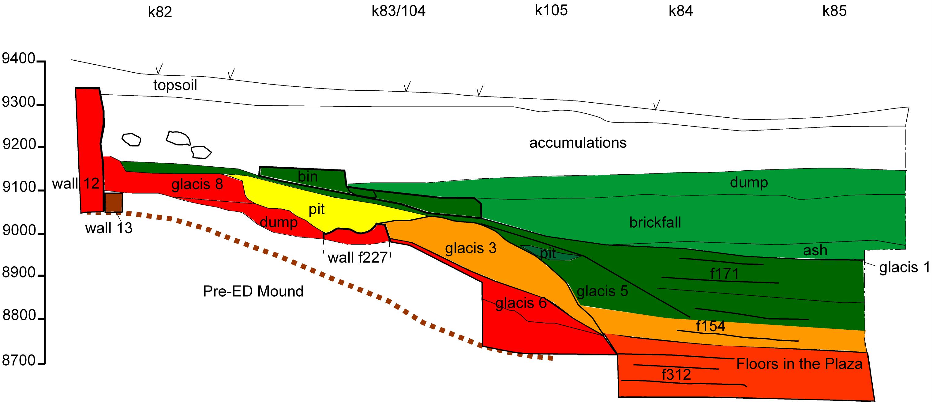 An thick band of earth and bricks (here in orange) glacis is dumped east of the staircase flank wall and on top of wall f227. Floor f154 was found in front of the staircase flank wall, attesting the use of the staircase and Plaza at this time.