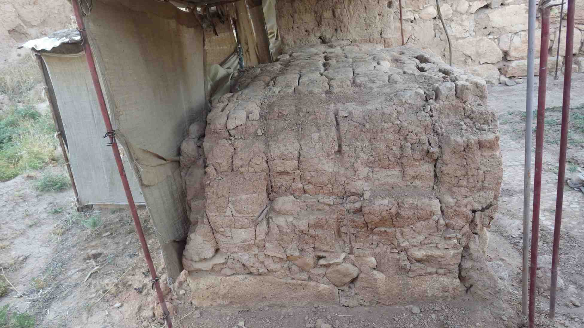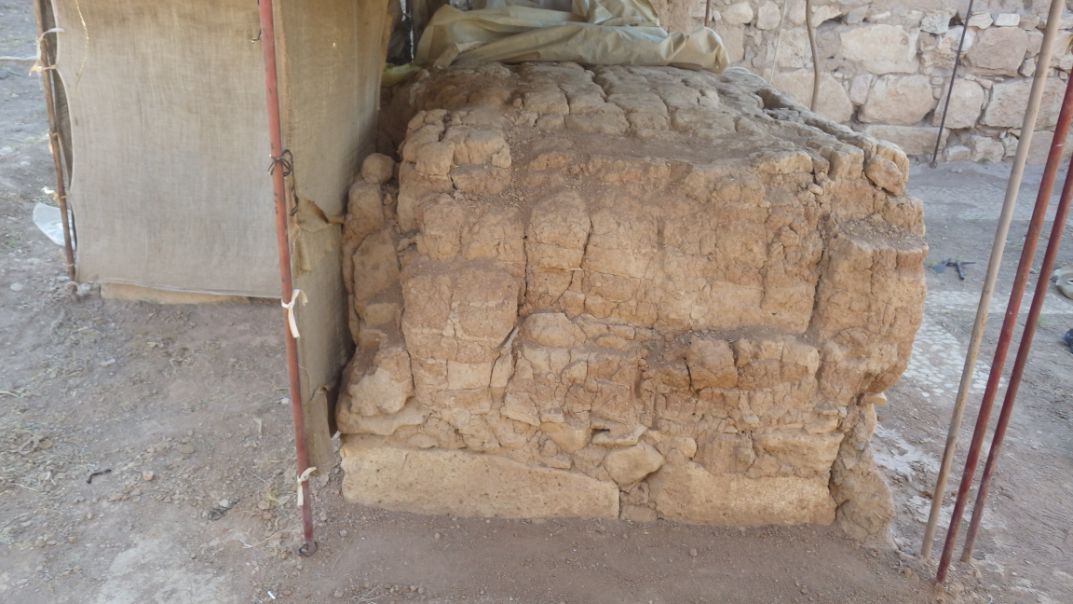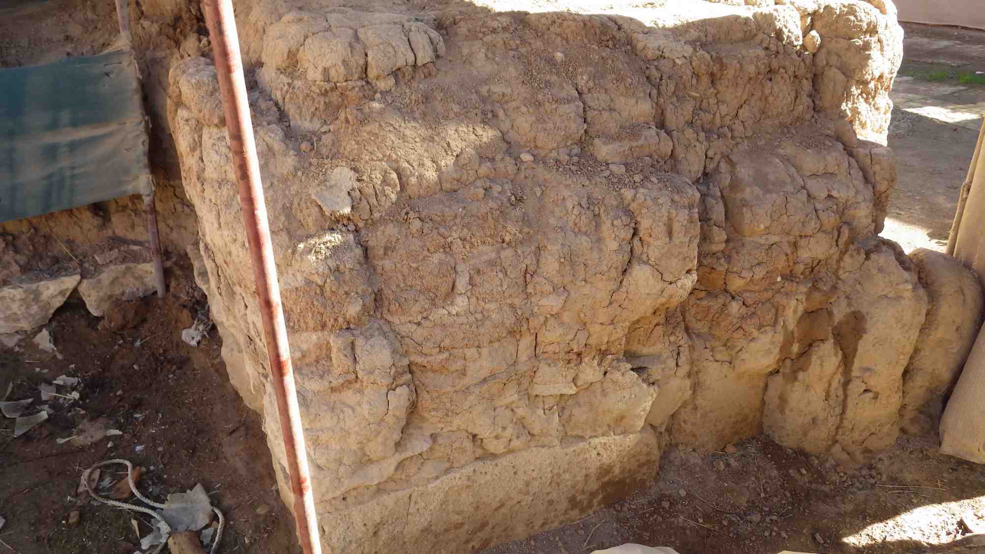 Wall appears dry and crumbly, the wall eroded in both left and right sides of the mud-brick section and lost parts of the mud bricks and the mud plaster. A trace of water is clear in the middle of the wall.