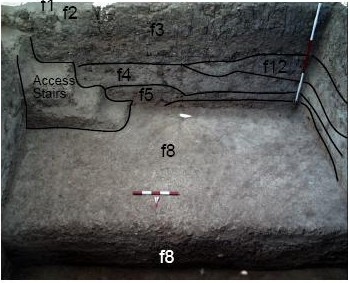 | Notes on analogical record | 1998-7-15 | jW | main view of the Southern section of the excavation. Visible are f1- f5, f8, the access stairway to the east and a lens or pocket of soil in the western half between f3 and f4. Also appearing in section in the lower portion of the picture is the unexcavated southern half of f8, left when the focus shifted to the north part of the square. [Input file: I715JLW.J / I715JLW.-J] |