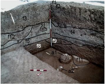 | Notes on analogical record | 1998-7-15 | jW | view to the Northwest at the end of the excavation showing the perspective from the top of the baulk, looking down into the square. v12a is a tight shot to show the complex relationship between f5, f8 and f9. [Input file: I715JLW.J / I715JLW.-J] |