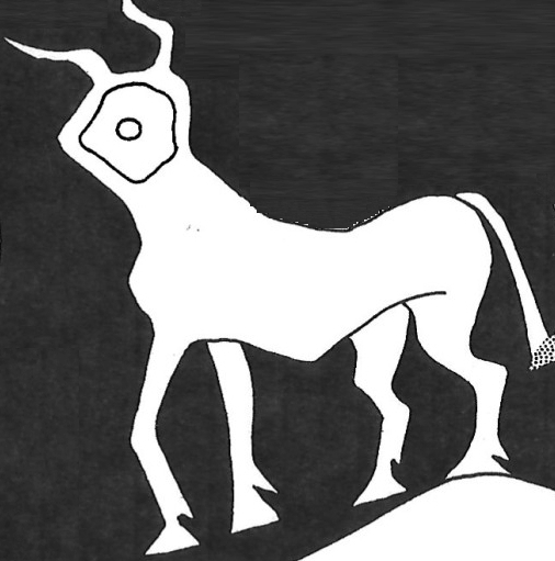 Animal depictions in this style have similar characterists as the humans. See for instance A6.147 INSERT W11d0607 where the eye is a wide oval with the large dot in the center. A line connects this eye with the nose and mouth. The two horns are shown in front view while the head is in profile. The horns are full and emphasized with sweeping lines. All these characteristics highlight the linear pattern of the design.