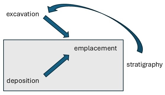 Emplacement is at the intersection of excavation and deposition. It is the static dimension of the record that serves as an interface between two dynamic dimensions, and the only one that can be properly documented. The excavation process lays it bare, and the depositional process is in turn inferred from it.