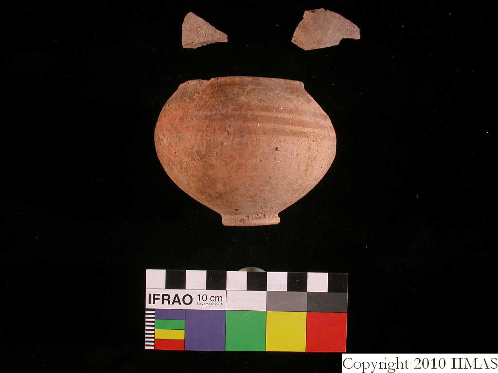 The brickfall contains unbaked red and gray bricks mixed with lots of broken pottery including some almost complete small vessels (i1, i2). In addition human bones were found mixed throughout. Three child skulls were identified (i3, i5, i6) indicating that the brickfall may have come from an area with graves.