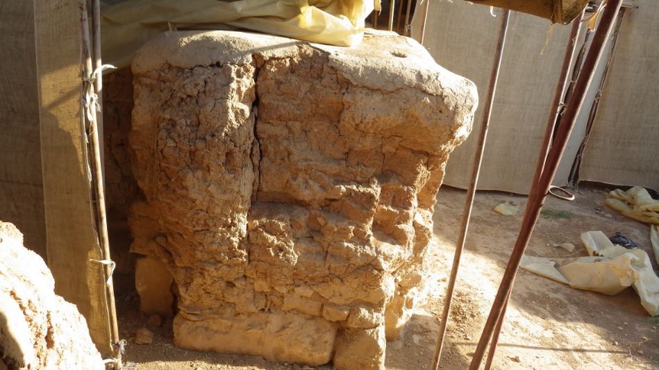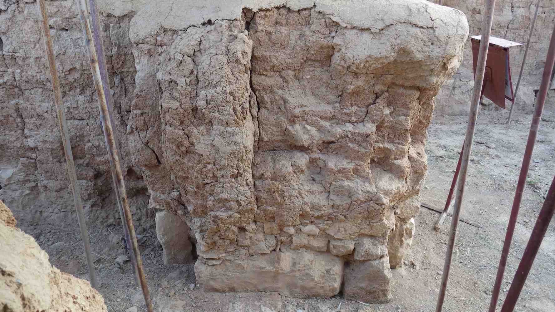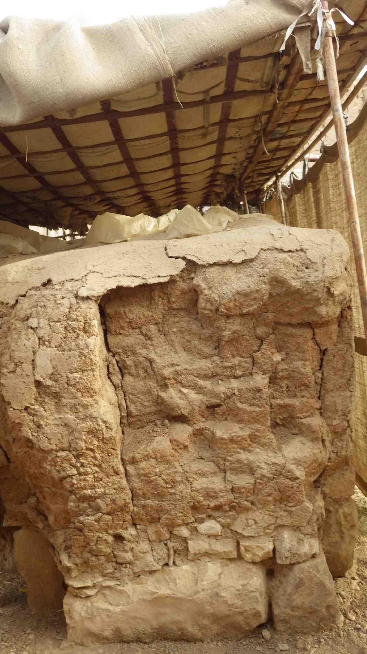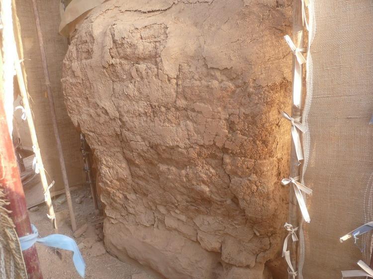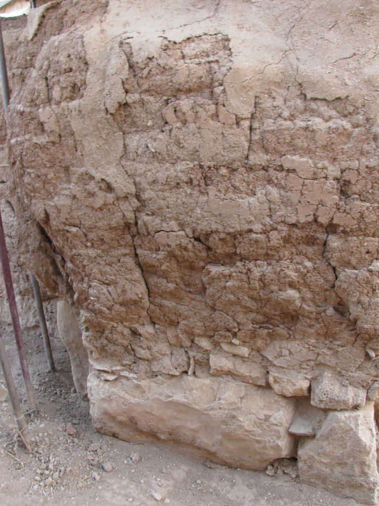 No loss in mud bricks, and the stones are in good shape. There are cracks, the wall slightly eroded in the right side, and mud plaster fell off. The wall seems fragile.