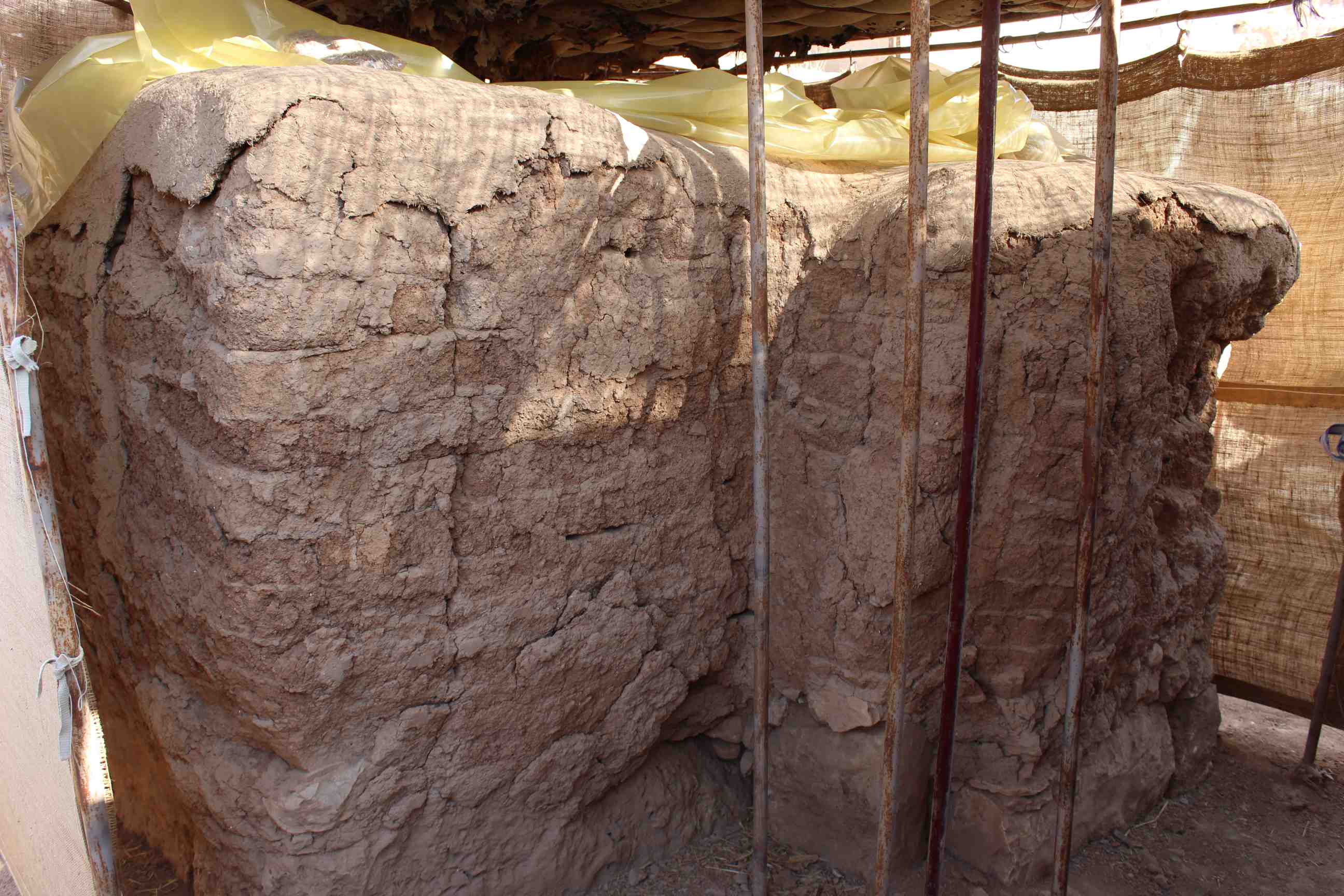 No loss in mud bricks, the stones are in good shape, there are cracks, the wall slightly eroded on the right side, mud plaster has fallen off especially on the left side and in the middle of the wall. The wall seems fragile and water has reached its surface through the Nylon and burlap on the left side. No visible other changes in the wall.