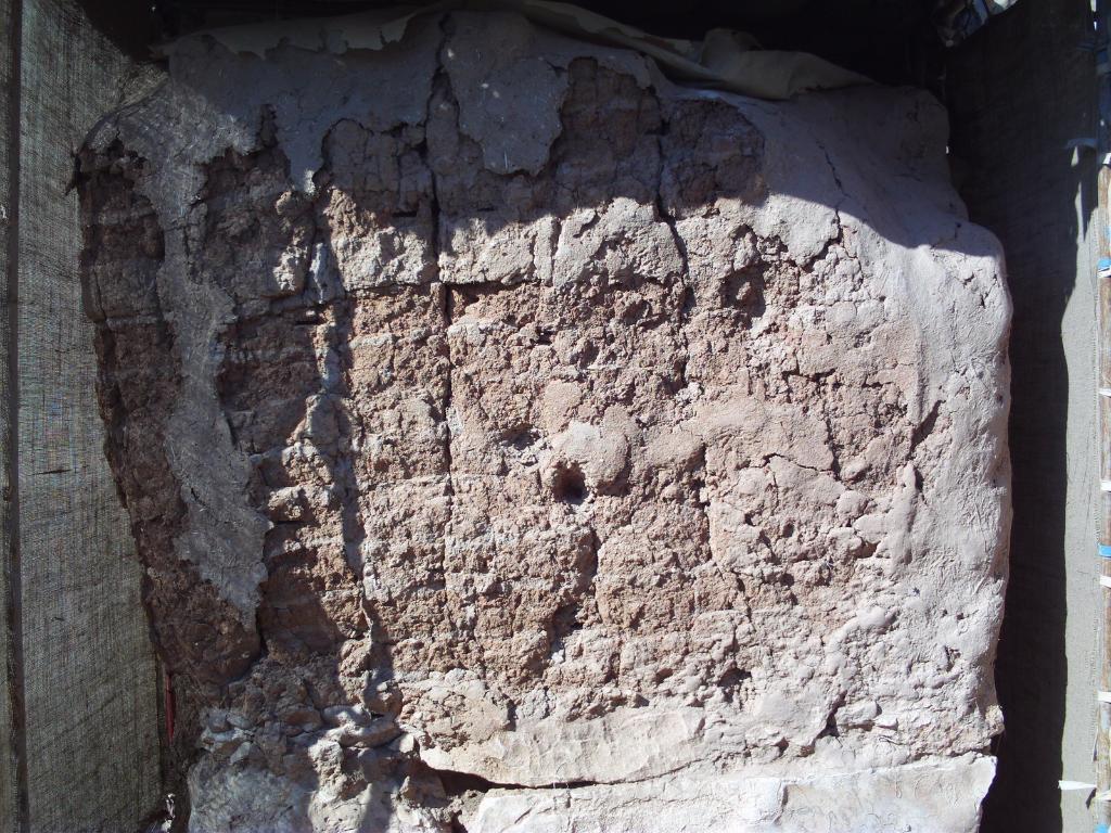Face of the wall is dry and the mud plaster layer seems to be peeling and some portions did fall off, but nothing serious that would affect the integrity of the wall.