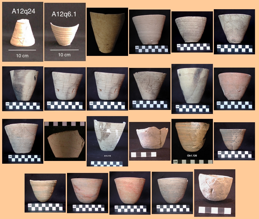 The chart below gives the statistics of a larger selection from eight excavation units, giving the total of vessels and sherds and the totals and percent of conical cups.