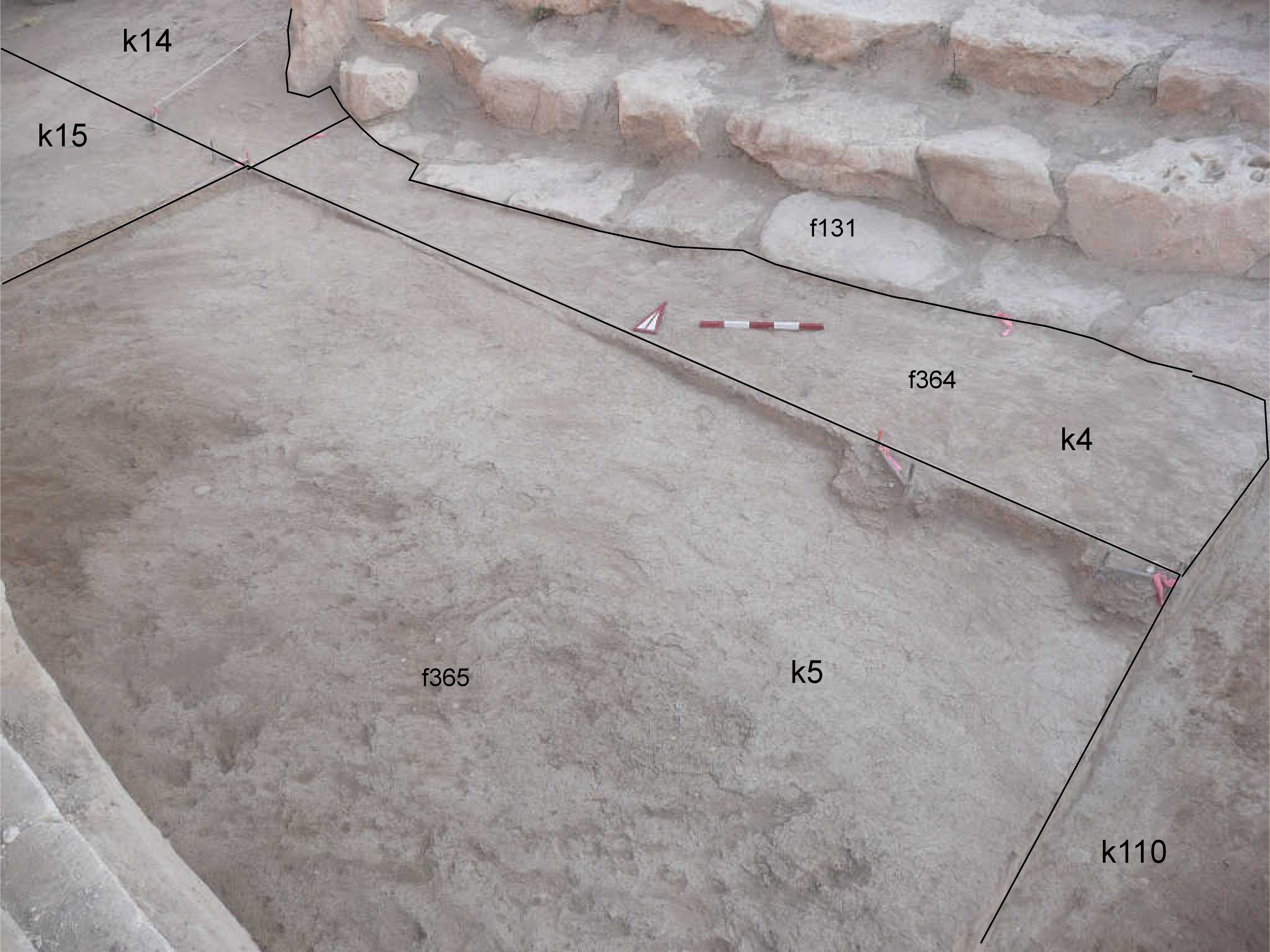 Phase 3sJ2B is the period of intensive use of the monumental access. In front of the apron a ca. 70cm thick sequence of multiple floors are the result of the use as open area. The Plaza was susceptible to natural build-up which became packed into floors through usage as walking surfaces. At the end of this period, the first two steps of the apron are covered. At a certain moment a lot of water coming from the apron