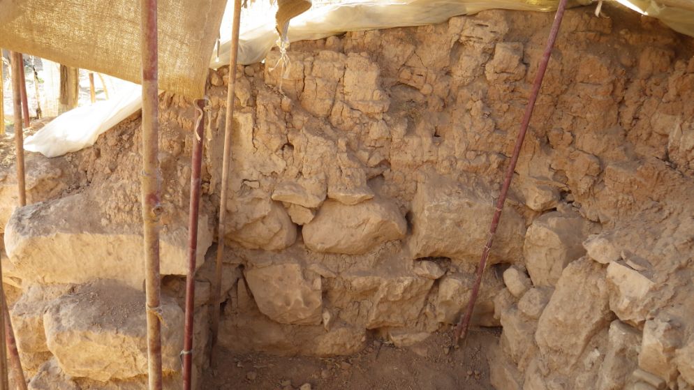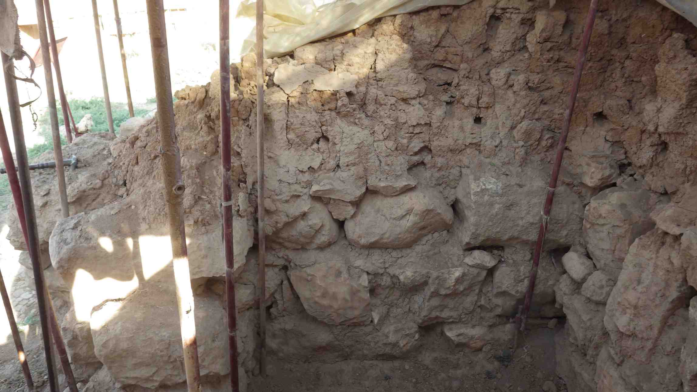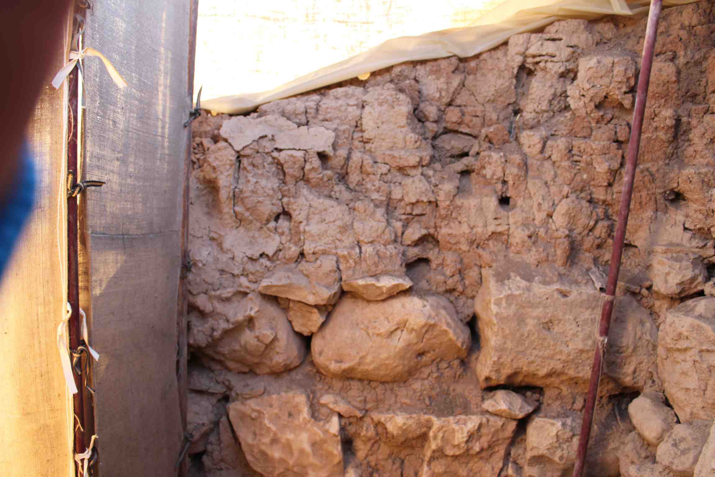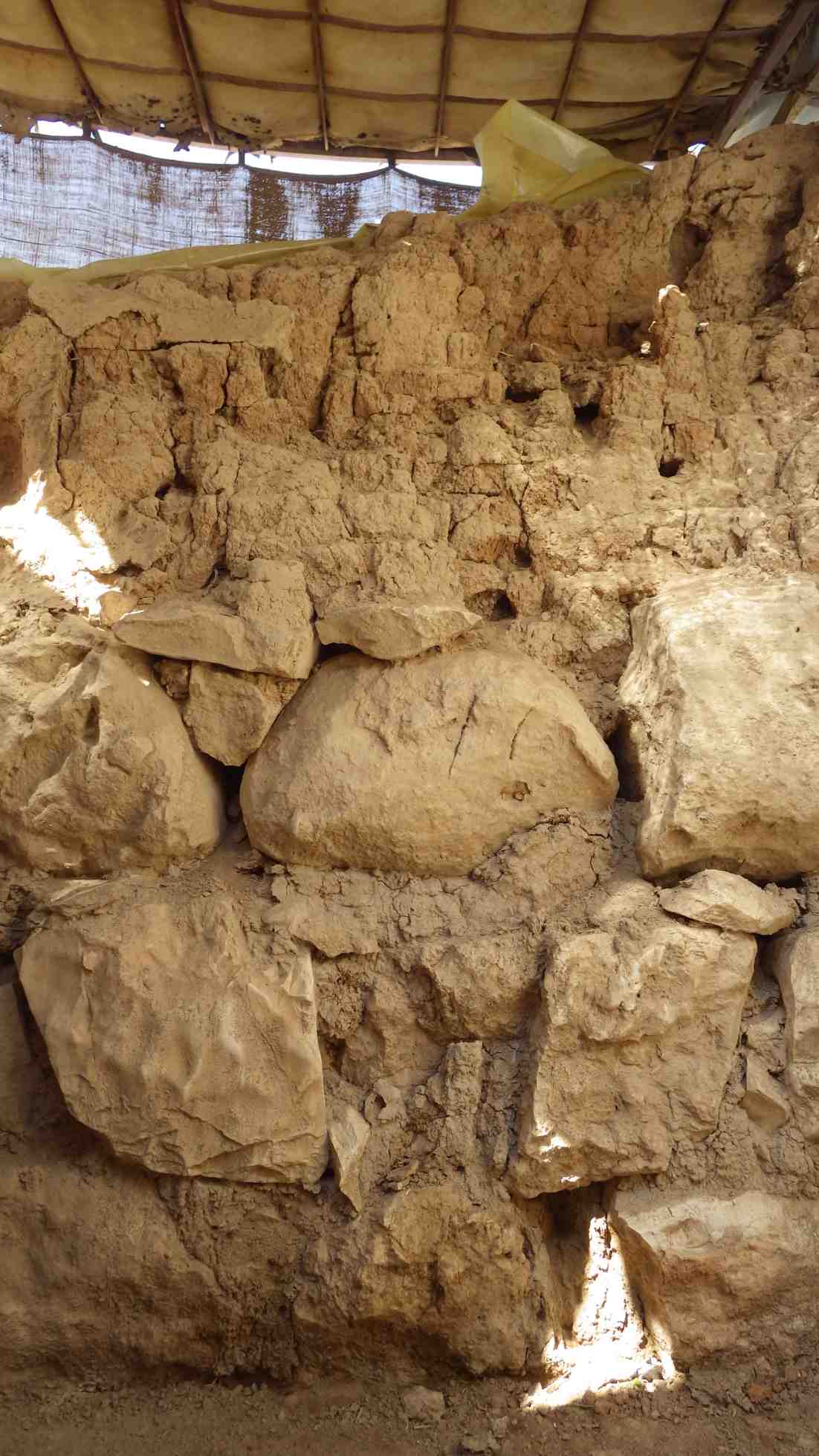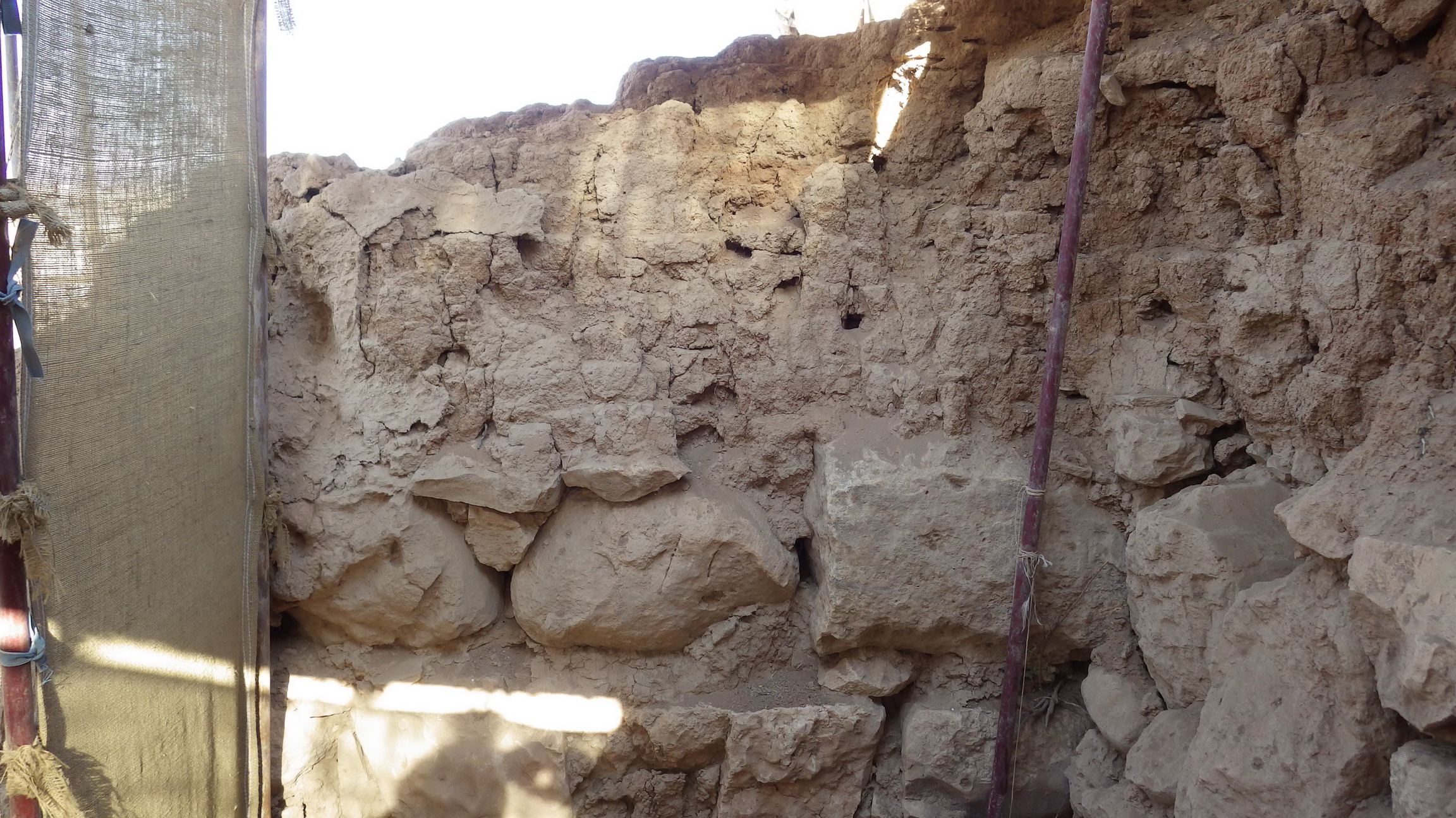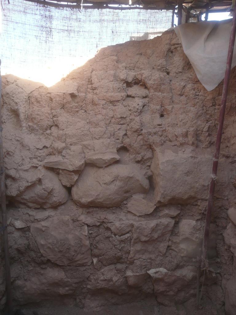 The stones are in good shape, with no loss in the mortar or mud bricks. The wall is dry, fragile, the mud-plaster have been lost at the top on the right side.