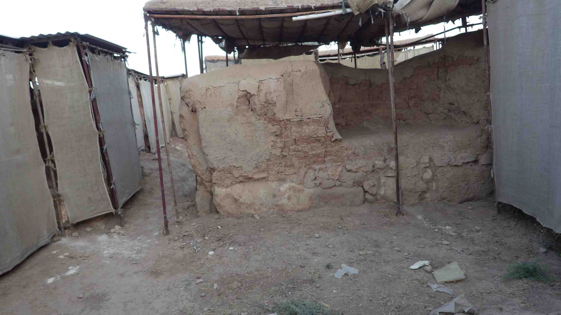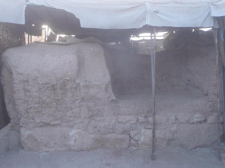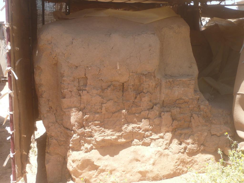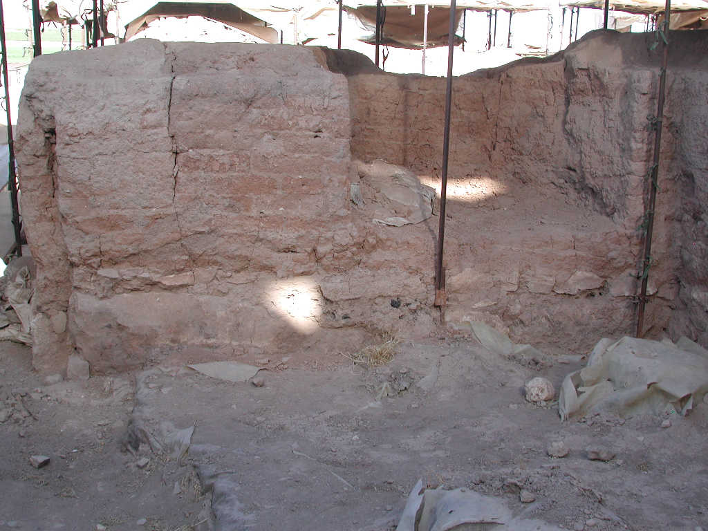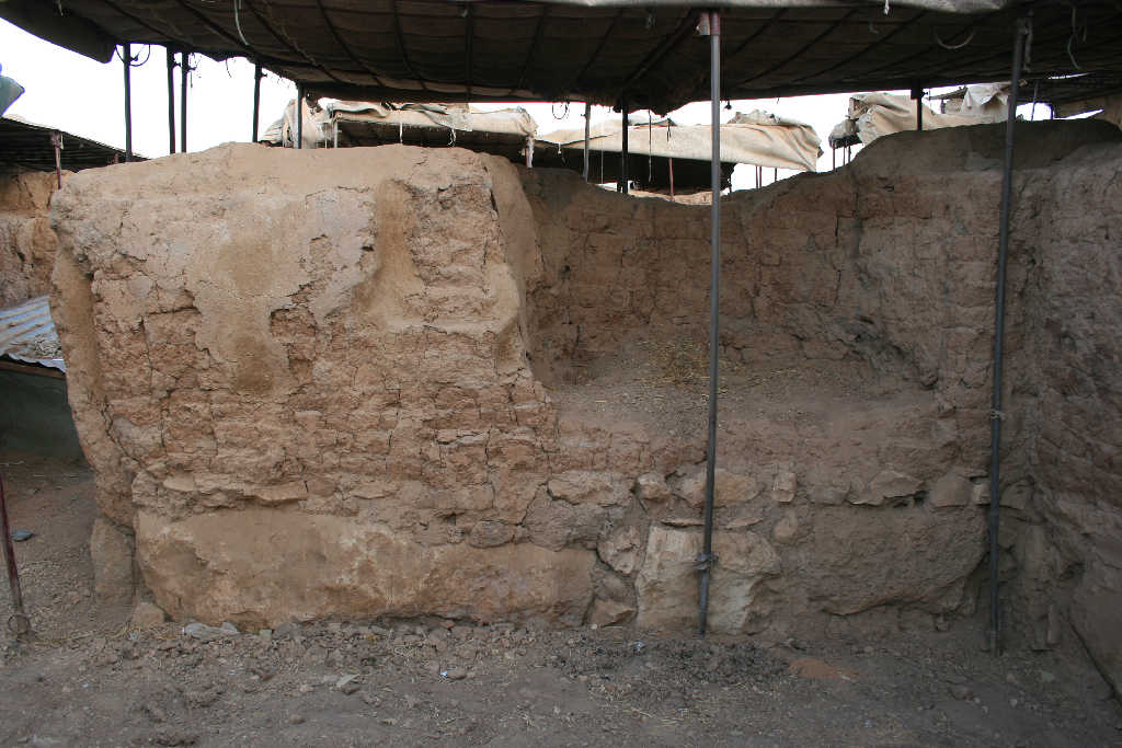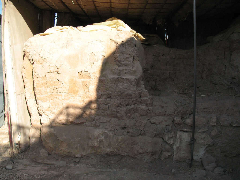 There are losses in the plaster layer on the right side of the wall, which probably caused the loss in mud bricks now visible in the middle section of that part of the wall. The cracks seem wider than last year. The stone foundation is in a good condition.