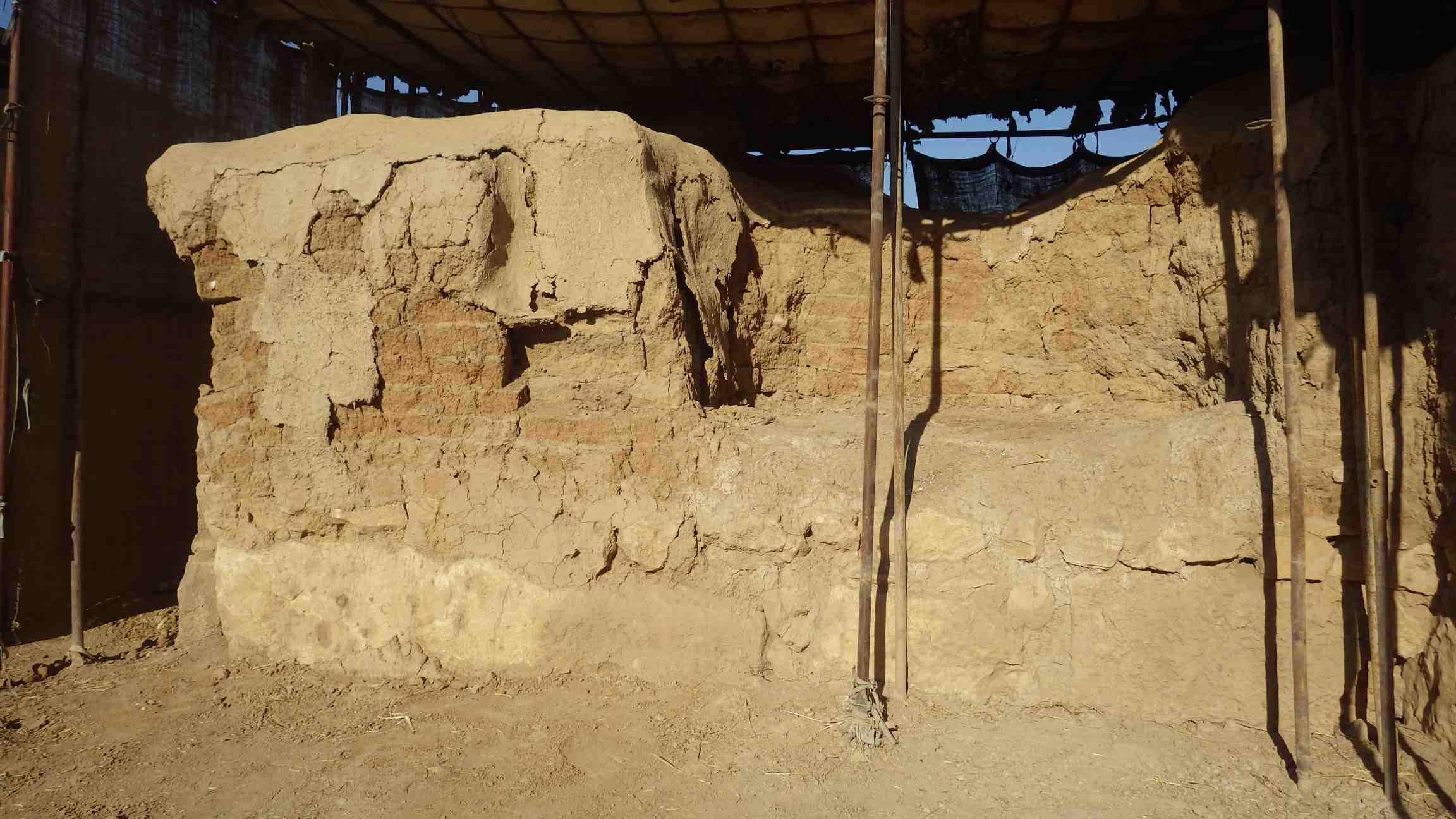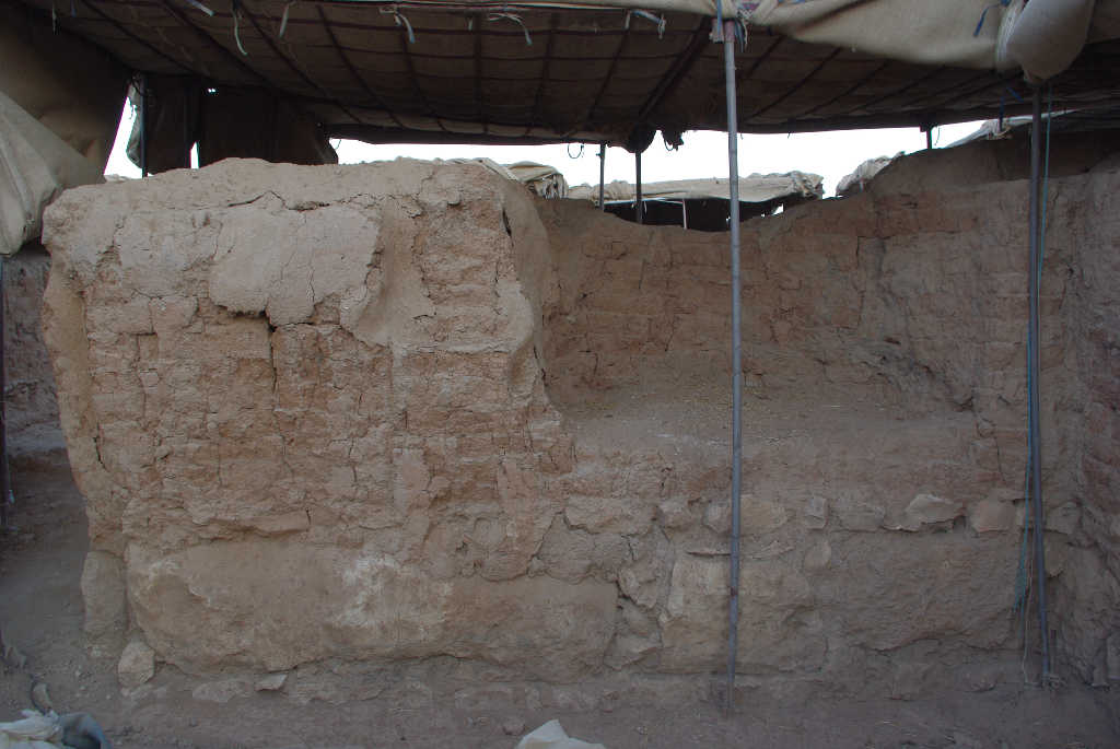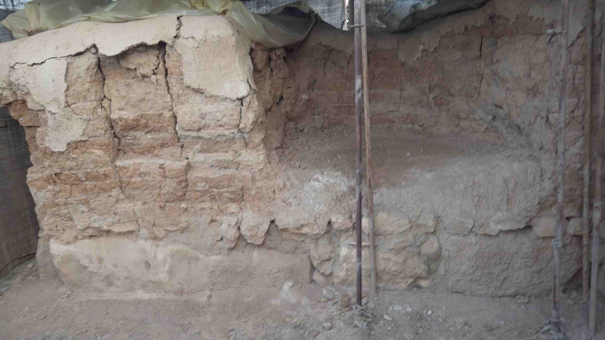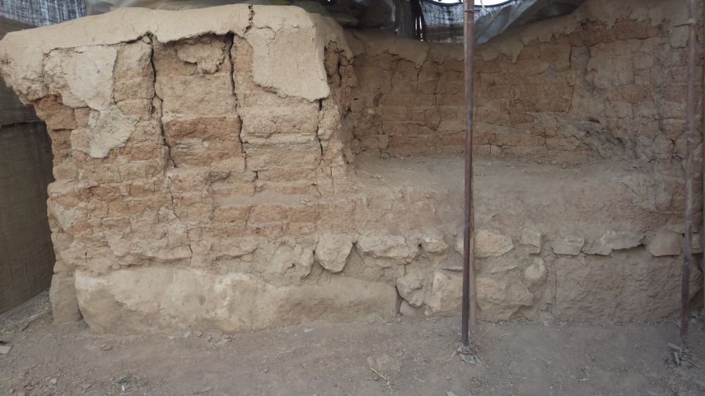 There are losses in the plaster layer on the left side of the wall, which probably caused the loss in mud bricks now visible in the middle section of that part of the wall. The stone foundation and the rest of the wall are in a good condition.