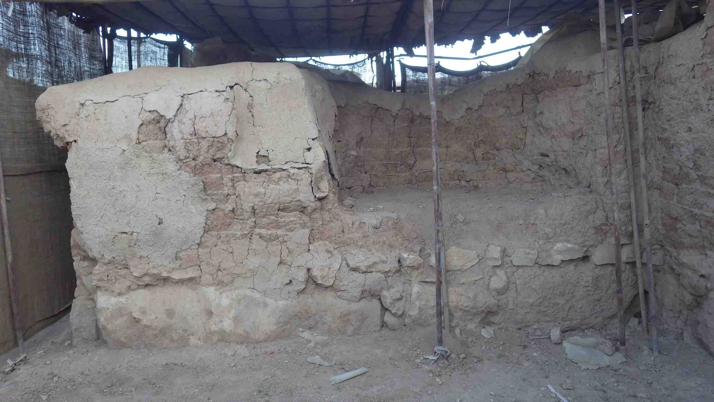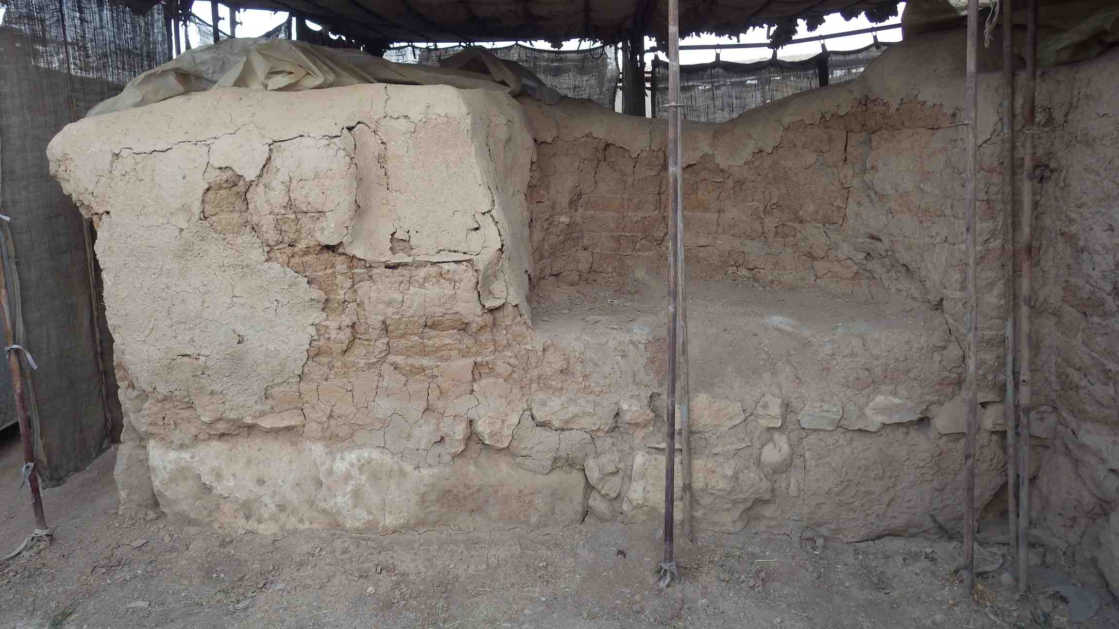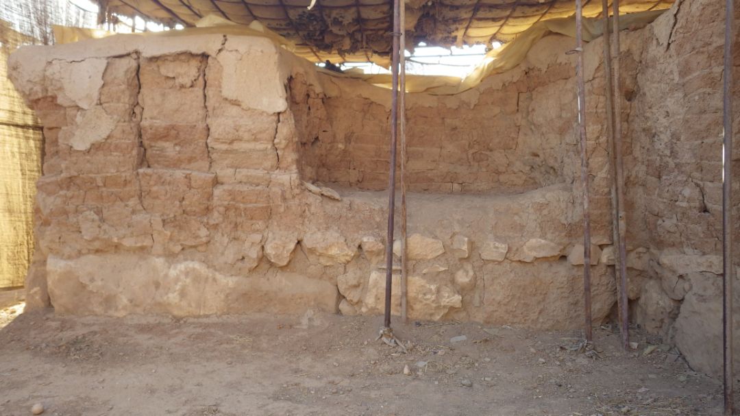 There are losses in the plaster layer on the left side of the wall, which probably caused the loss in mud bricks now visible in the middle section of that part of the wall. The stone foundation and the rest of the wall are in a good condition.