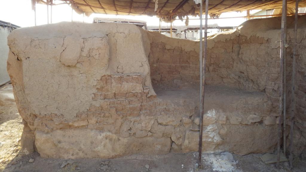 Overall, the wall is in a good condition. The pit experienced no changes or erosions. On the left side of the wall, a portion of the mud plaster was eroded and fell off, revealing a small section of the mud bricks under it. A small crack is visible in that area.