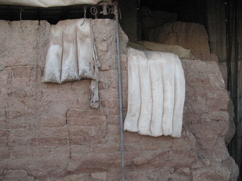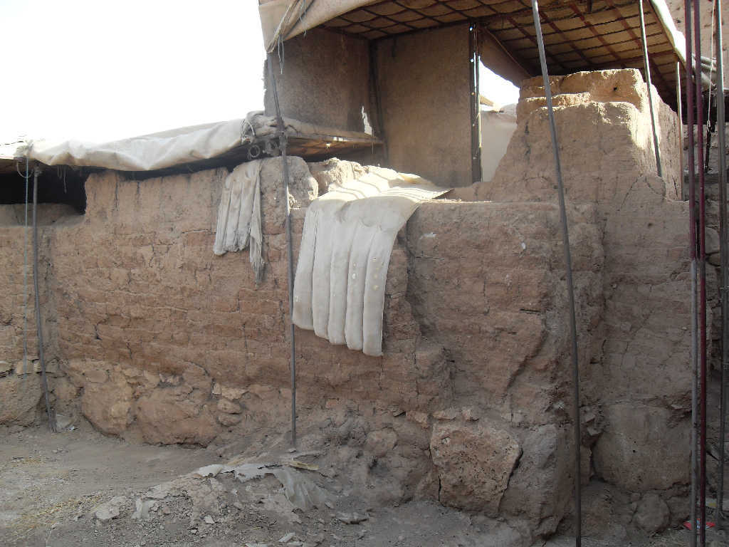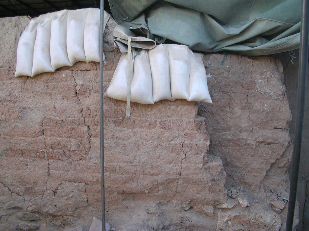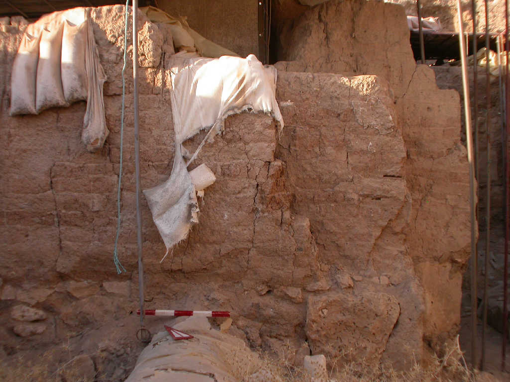 The eastern half of this wall is in very poor condition, and the entire right edge has been lost. The remaining section on the left is badly gapped and despite previous repair attempts is now being held in place only by the bisacce and the pole of the covering. Will suffer major damages if not addressed (August 2010, E. Drolet)