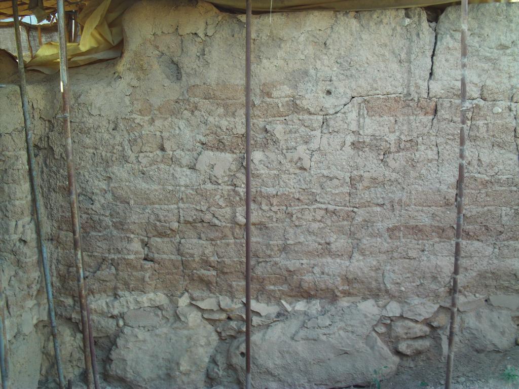 The stones are in good shape, there are some cracks in the middle and on the right side. No changes on the formed vertical crack on the far-left part of the wall. Some loss in the mud brick layer. Overall, no changes at the wall.