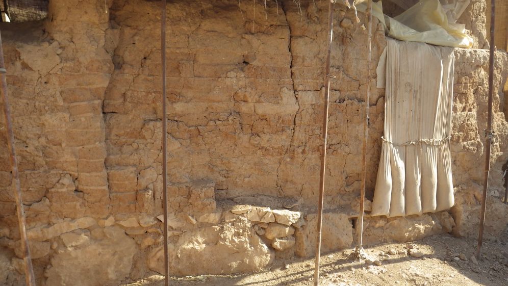 The stones are in good shape, there are some cracks in the middle and on the right side. There is a new vertical crack that formed this year on the far-left part of the wall, with some loss in the mud brick layer. Overall, the wall is in a good condition.