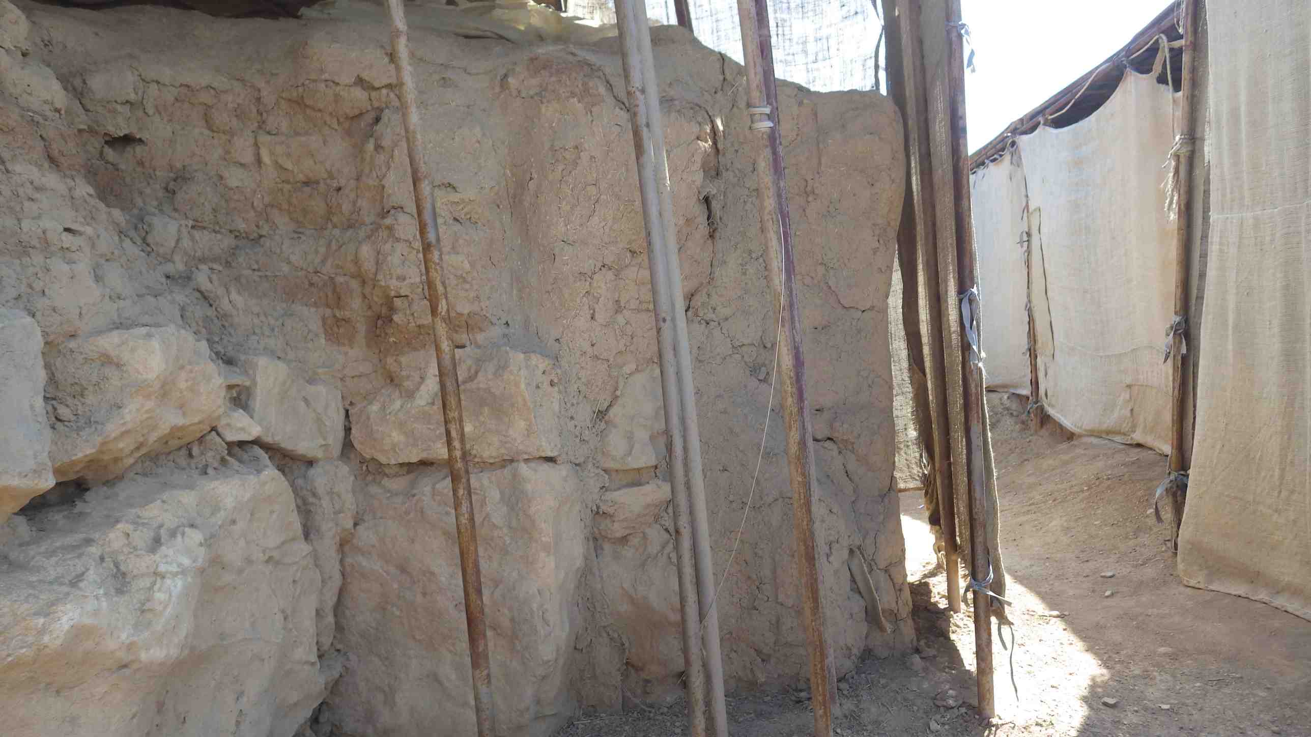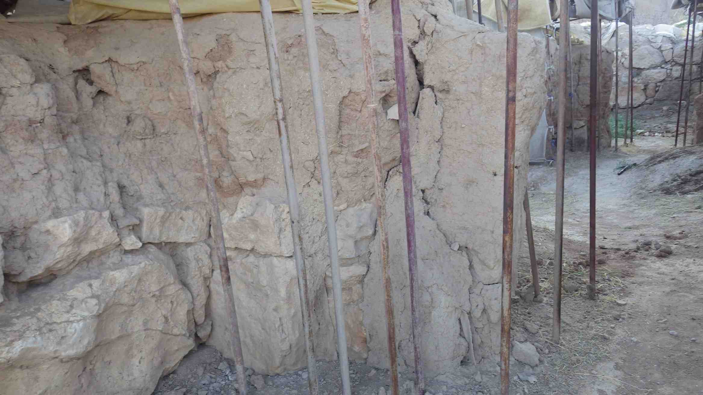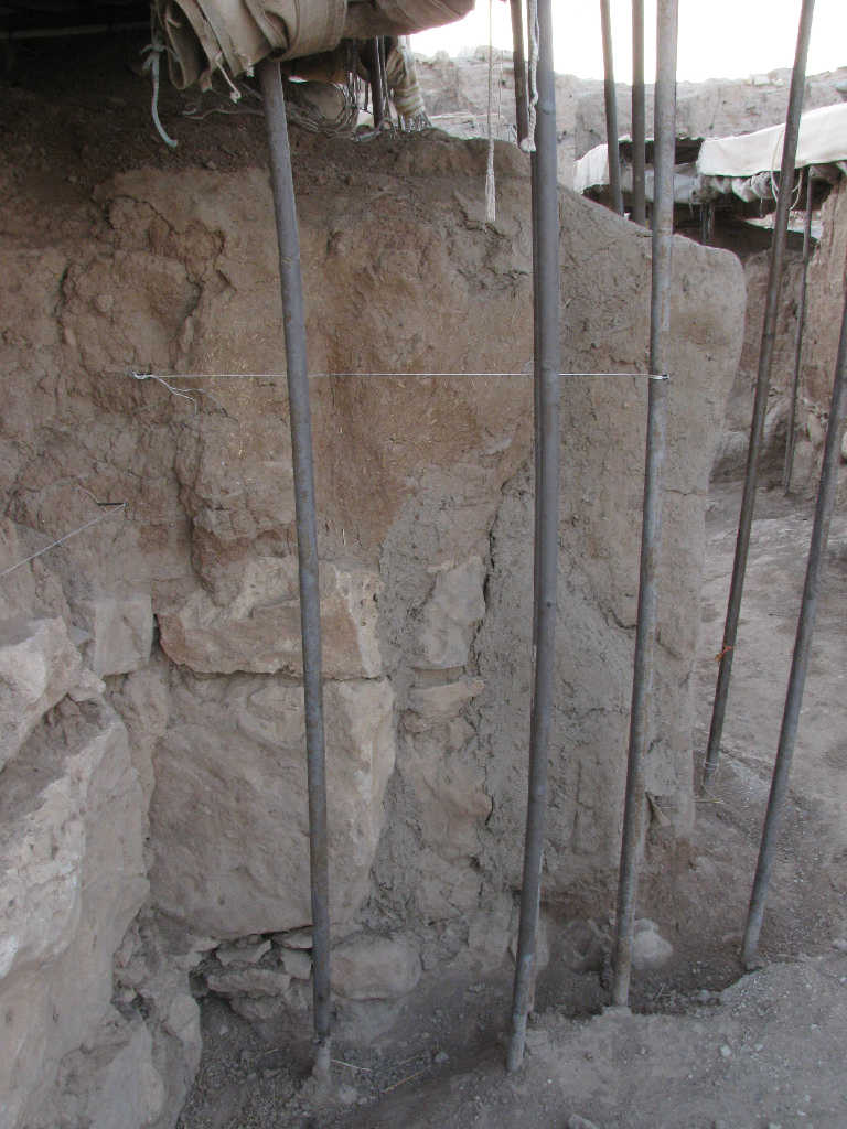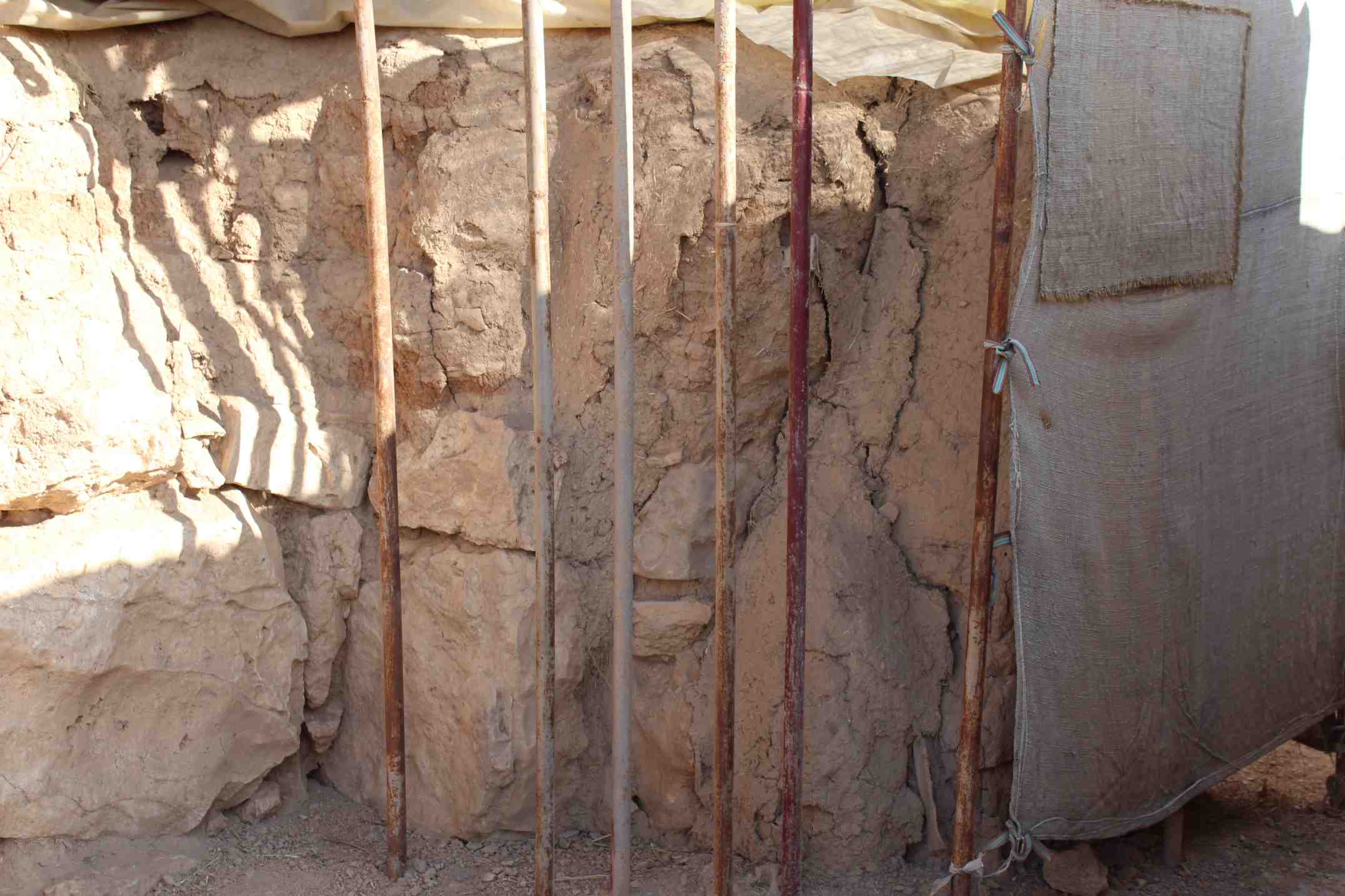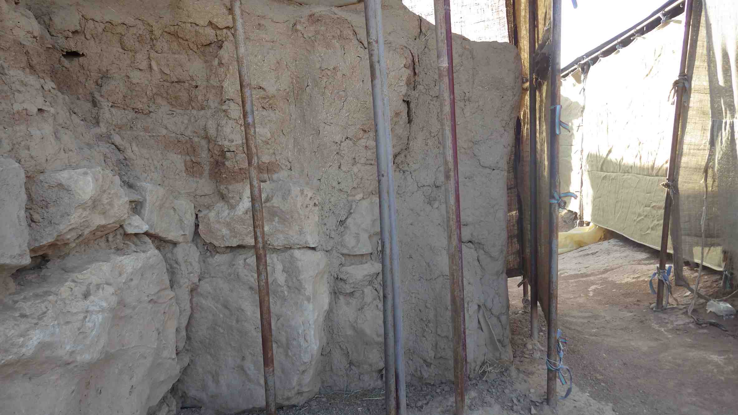 Overall, the wall is in good condition. The mud plaster has peeled in some spots and caused some cracks, the stones are in good condition.