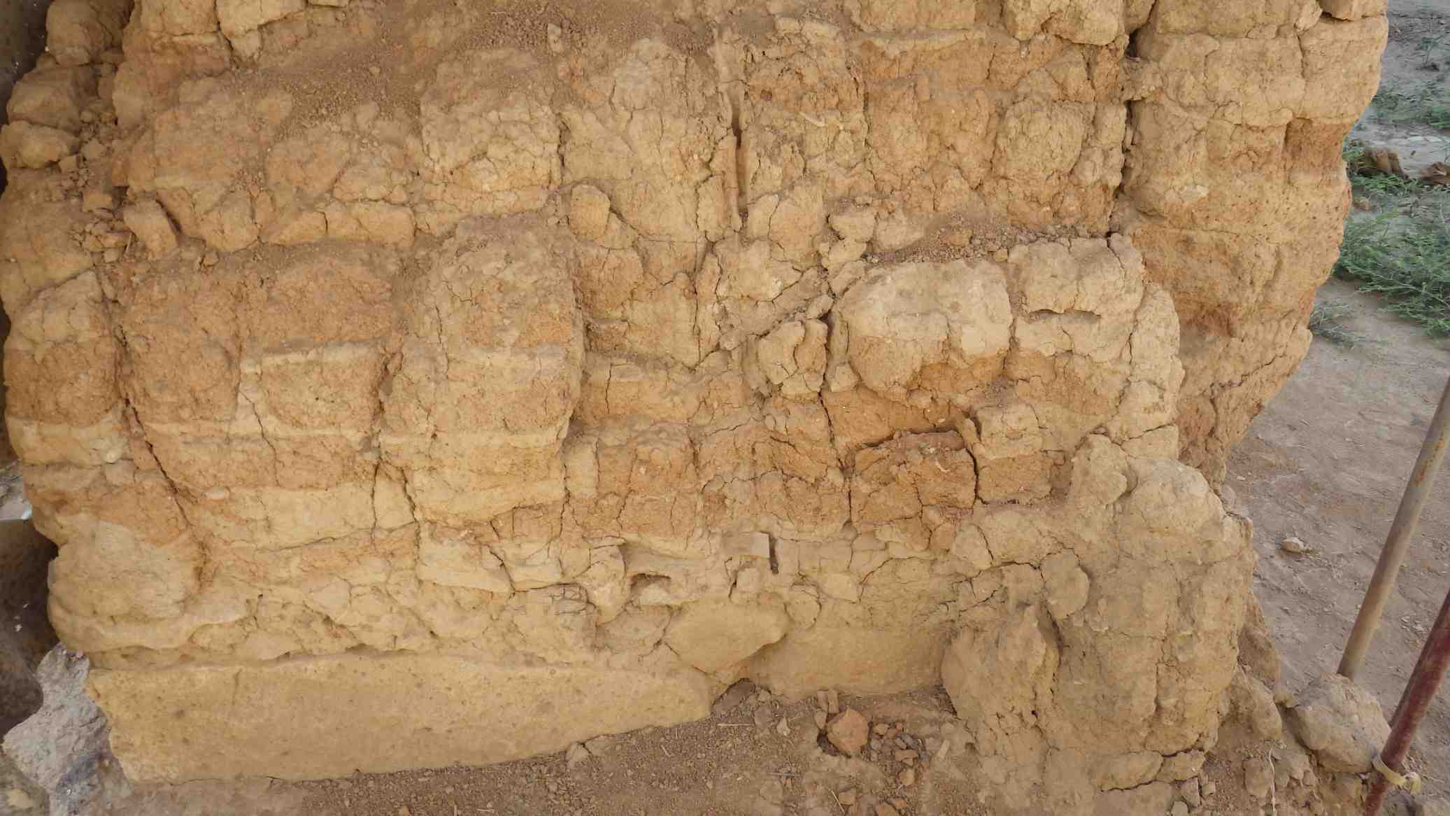 Wall appears dry and crumbly, the wall eroded in both left and right sides of the mud-brick part and lost parts of the mud bricks and the mud plaster. A trace of seeping water is clear in the middle of the wall.