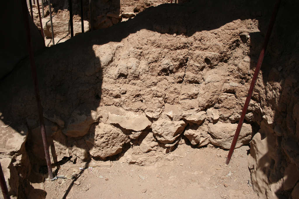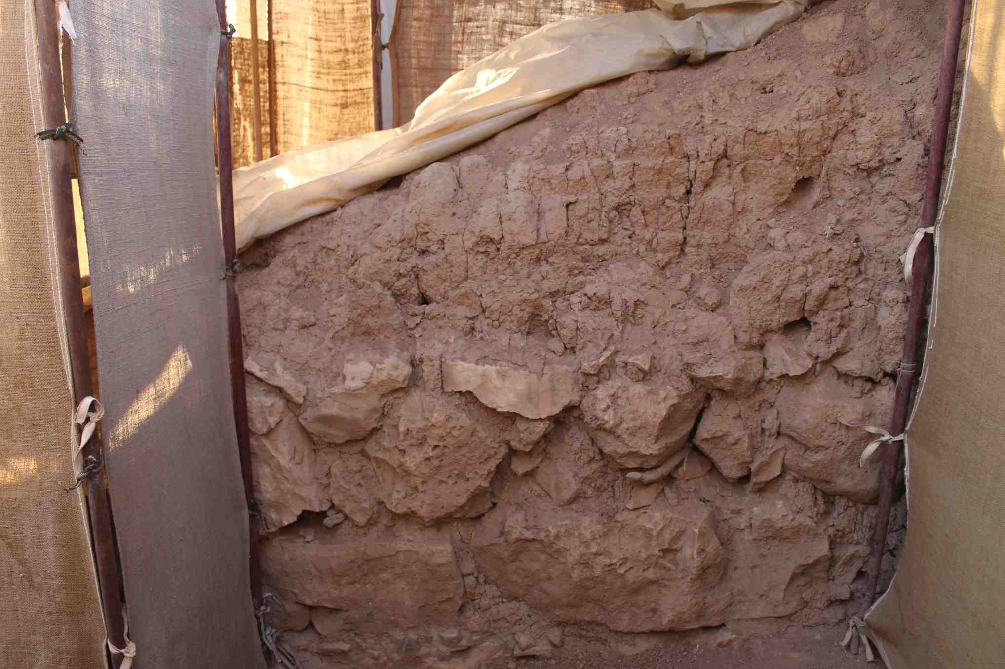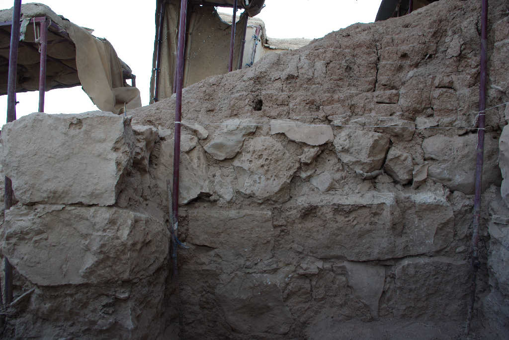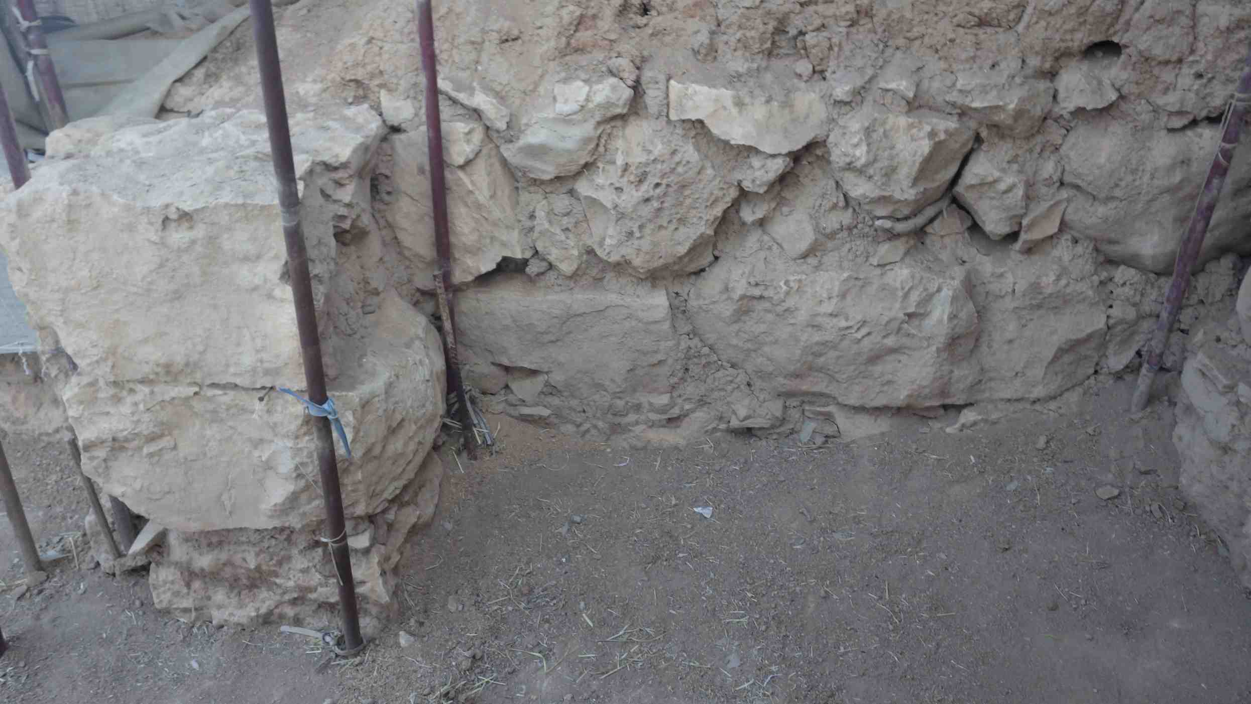 The stones are in good shape, the wall is dry in the top part especially the surface layer of plaster on the right side. Overall, the wall is in good shape.