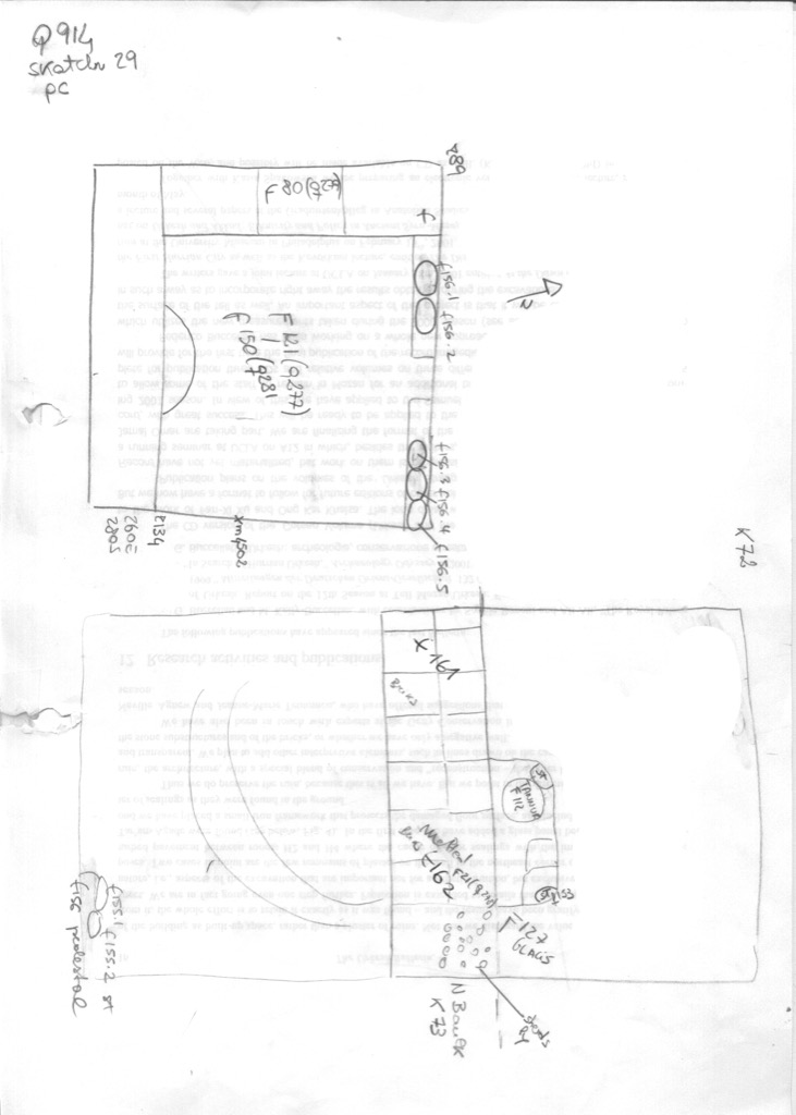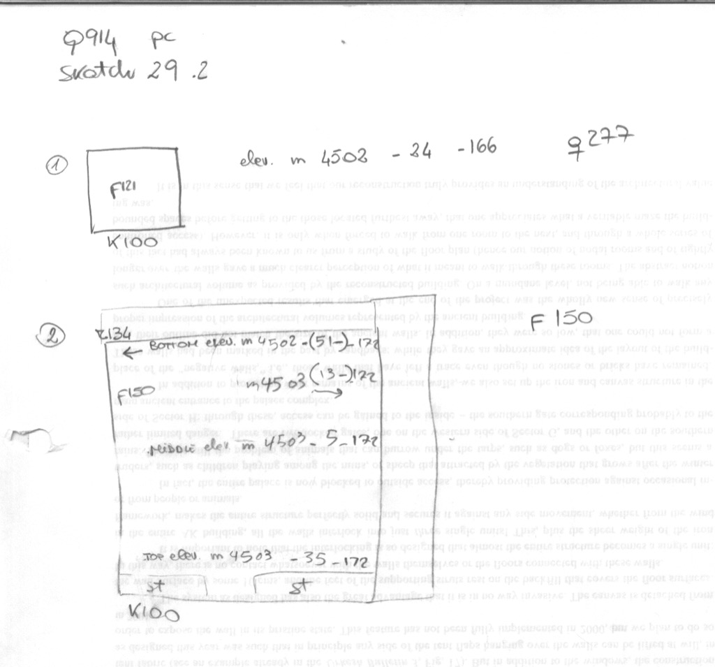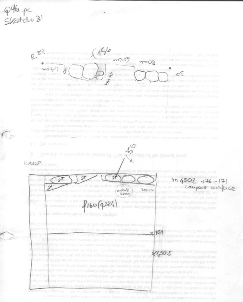 Sketches are made to scale based on the topographical grid of the area, and they represents active unit loci. The main purpose is to illustrate the daily excavation activities and locate the spot finds of objets, in addition to providing an approximate localization of the various q-lots within the same feature.
