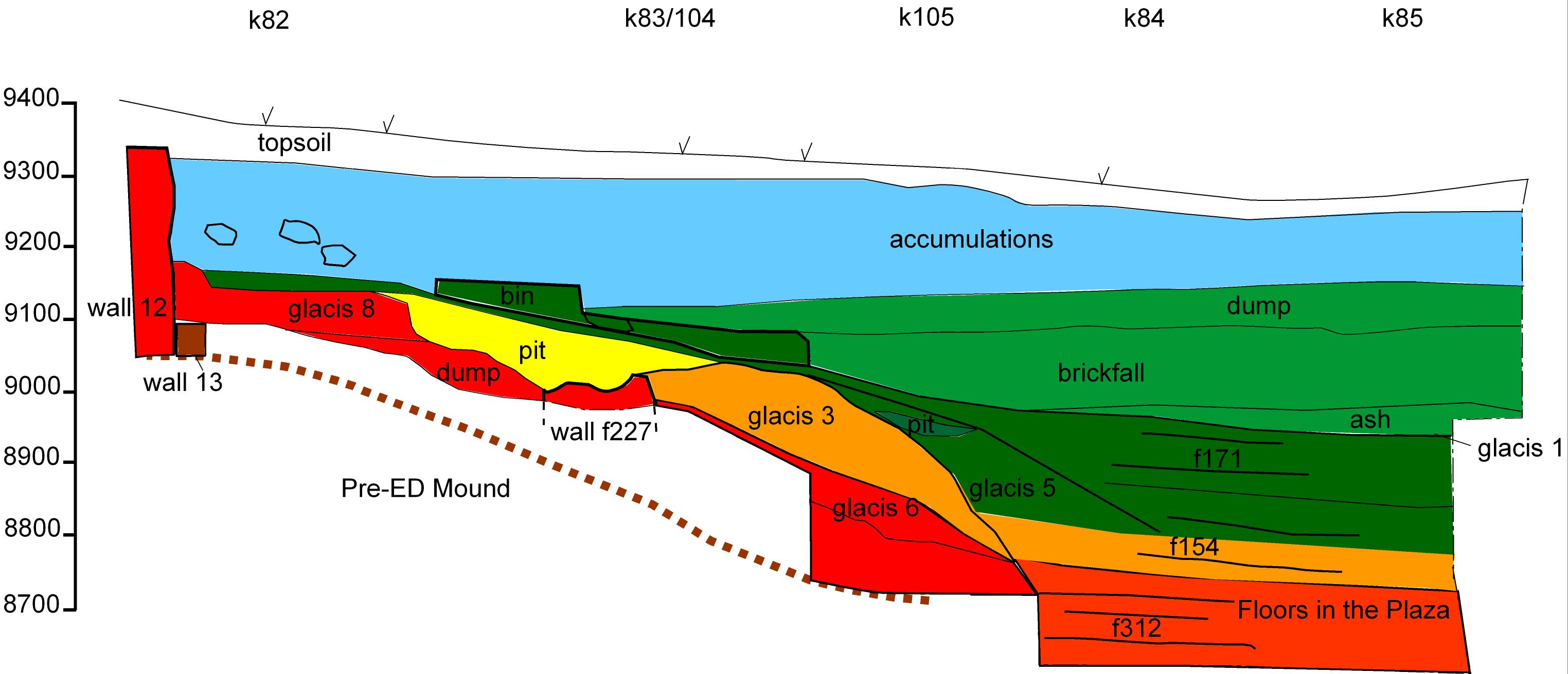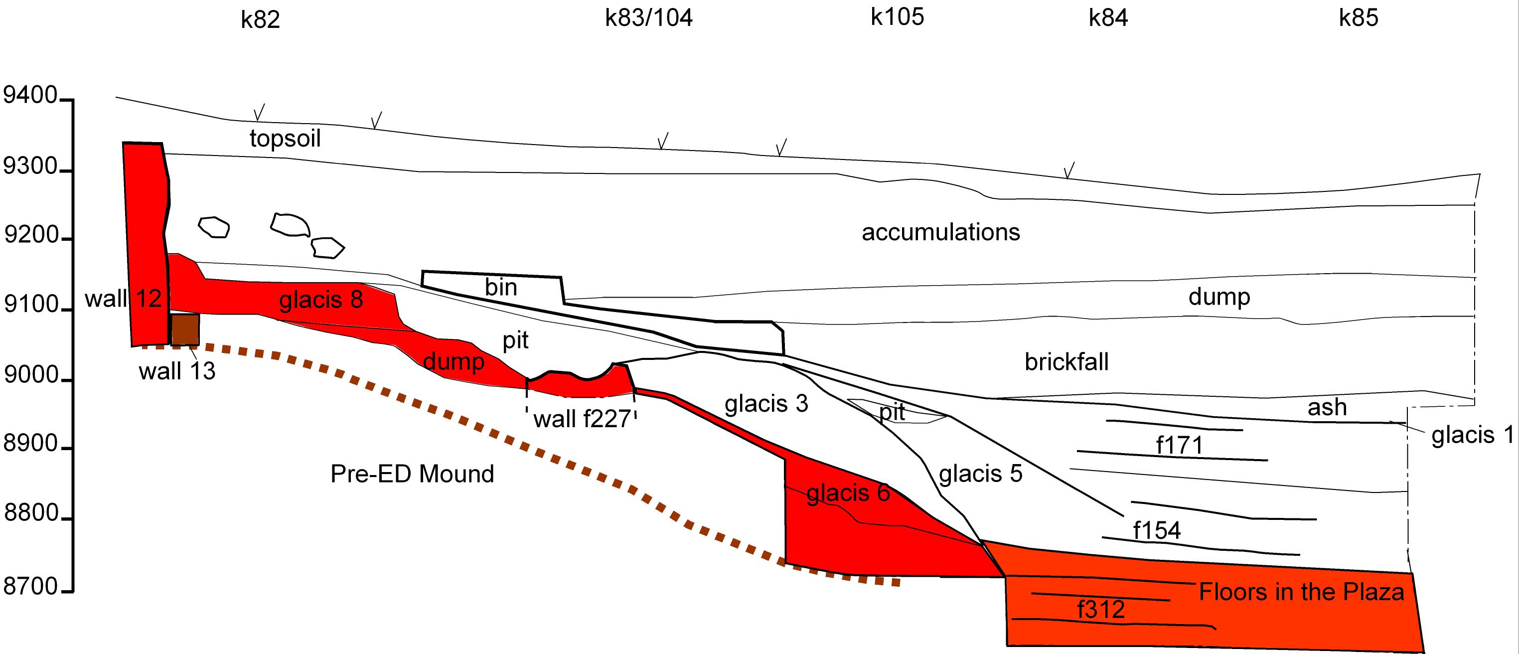 The EDIII period, highlighted in red, is a phase characterised by a wealth of activity at the Temple Terrace. This period also encompasses the major construction phase of the Temple Terrace, during which great monumentality was achieved. To the north is wall 12, which marks the eastern boundary of the Temple Terrace. The monumental staircase was constructed alongside flank wall 6. This wall was built directly on top of the mound surface of stage 1. A dump and glacis 6 were laid south of wall f227 and east of wall 6. During this period the area to south of the staircase, the Plaza, was used intensively: several floor surfaces were found both in J2 and J6 (floor f312 identical to J2f359, see v138).