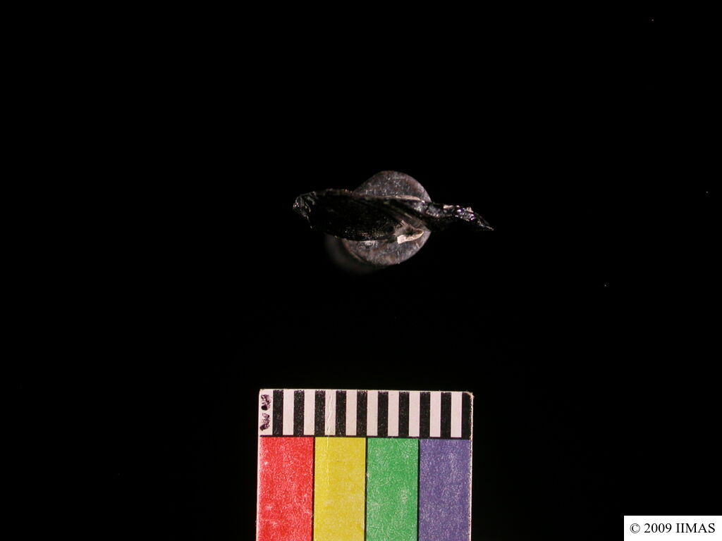 its an obsidian flake. the shape is irregular