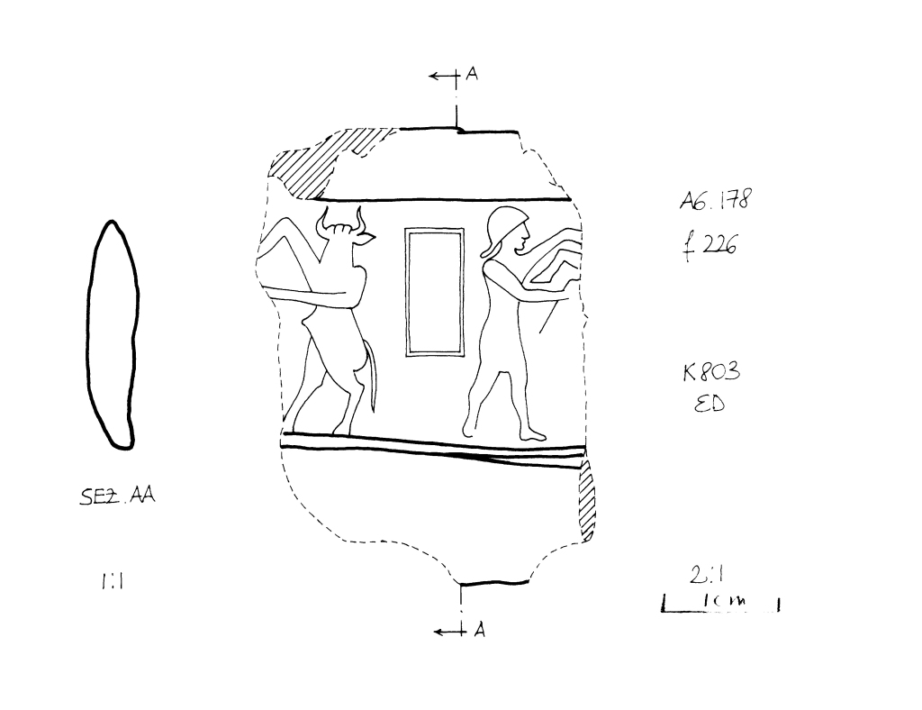 | Iconographic description, specific | 2005-08-00 | mKB | bullman with his head facing forward and body facing left with arms raised fighting, his right arm is elongated with the raised elbow prominent. The inscription box is placed in the center between the bullman and the hero in a somewhat pointed hat (or helmet?) and short skirt facing right with arms raised fighting an upright figure with hoofs. [Input: ZI827mKB.j] |