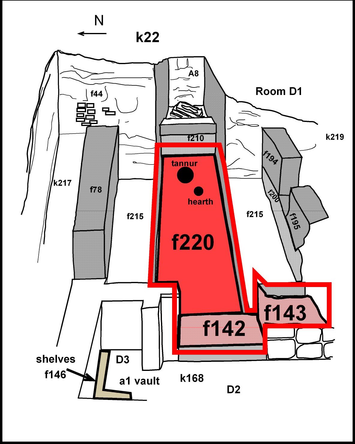 Abuts in unit A6 is relatively high, reaching about 34%. One of the clearest examples is accumulation f220, which consists of hard pinkish-brown deposits with gray patches and includes carbonized material, as well as pottery sherds and bones; this accumulation directly abuts threshold f142. Another example is threshold f142 itself, which consists of a line of mud-bricks extending from north to south along doorway a4 and abuts wall f143.