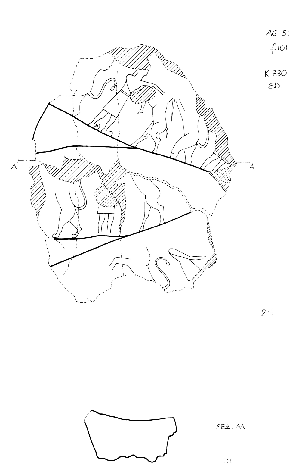 | Iconographic description, specific | 2005-08-00 | mKB | Three rollings in TIP. Upper rolling: lion body facing left with long upturned tail which curls outward at the end, human in short shirt with belt facing right holding the horn? and leg? of a caprid, the lion facing left is attacking this caprid. Legs and bottom of skirt of the human. Middle rolling: lion facing left, bottom of skirt and legs of human, lower body of caprid facing left. Lower rolling: lion facing left, human, here he appears to have a fringe decorating the front of the skirt. [Input: ZI827mKB.j] |