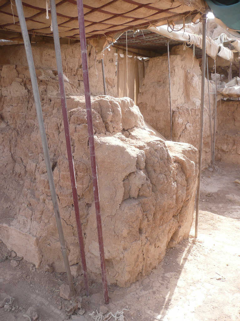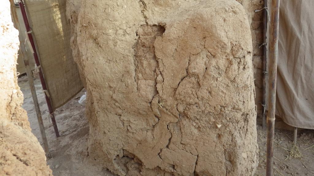 The entrance between rooms C5 and C7 was narrowed at a later phase, after the palace’s original function was abandoned, by building a gray mud brick wall in front of the original wall. In 2017, the wall lost the added section. Its current condition is fragile and crumbling, and the cracks appear unstable, which may lead to further loss of mud brick. A slight loss of bricks is also noted compared to last year.
