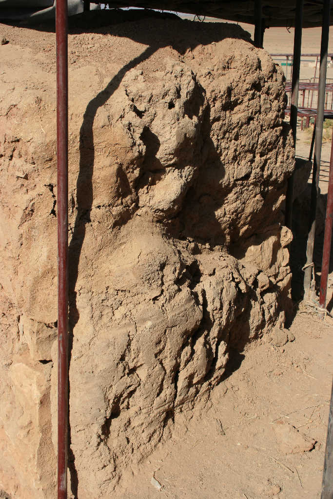 There have been large losses to the south face of the doorway, with sections of the outer surface lost. The ancient plaster which narrows the doorway is separating from the mudbricks, and a large portion has been lost. There is crumbling of the exposed inner surface of the bricks, especially in the areas most exposed to the elements (August 2010, E. Drolet)