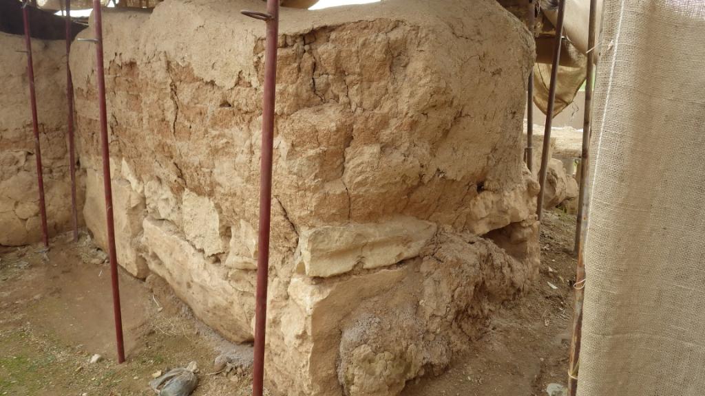 The wall surface subjected to erosion in 2016 and 2017, eventually leading to its collapse. It is important to note that the collapsed section does not belong to the original structure but to a reconstructed part added later after the palace’s primary function was abandoned. In contrast, the original wall appears to be in good condition, with no changes compared to last year.