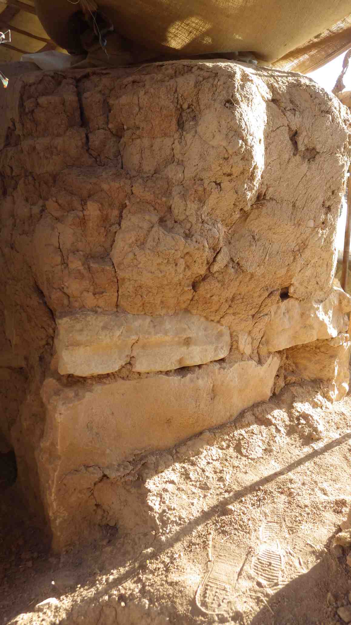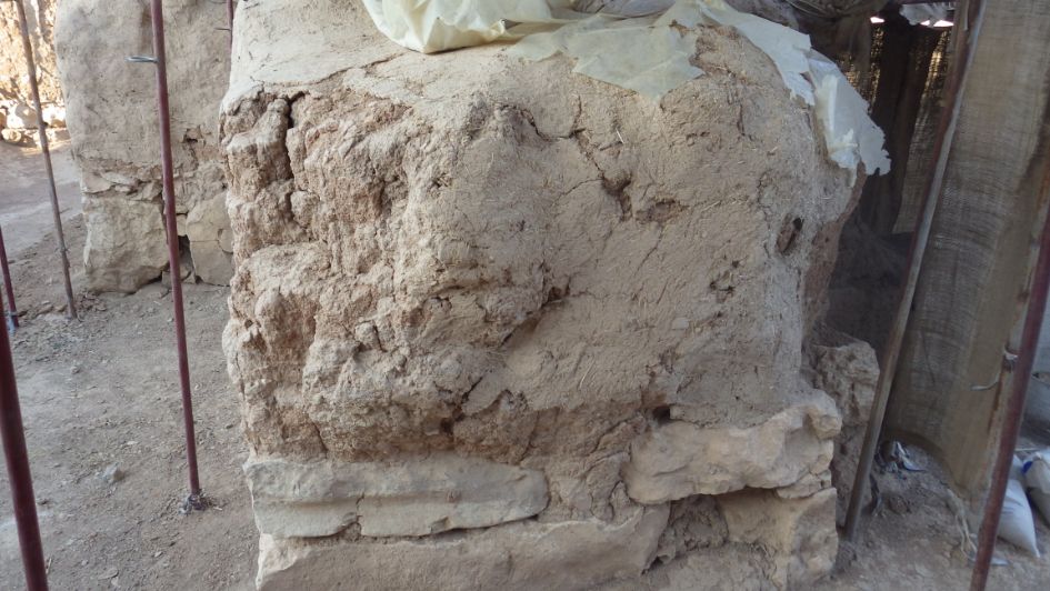 No loss in stones, mud bricks or mortar, the mud plaster has peeled off in some spots. The wall has slightly eroded in the top left part.