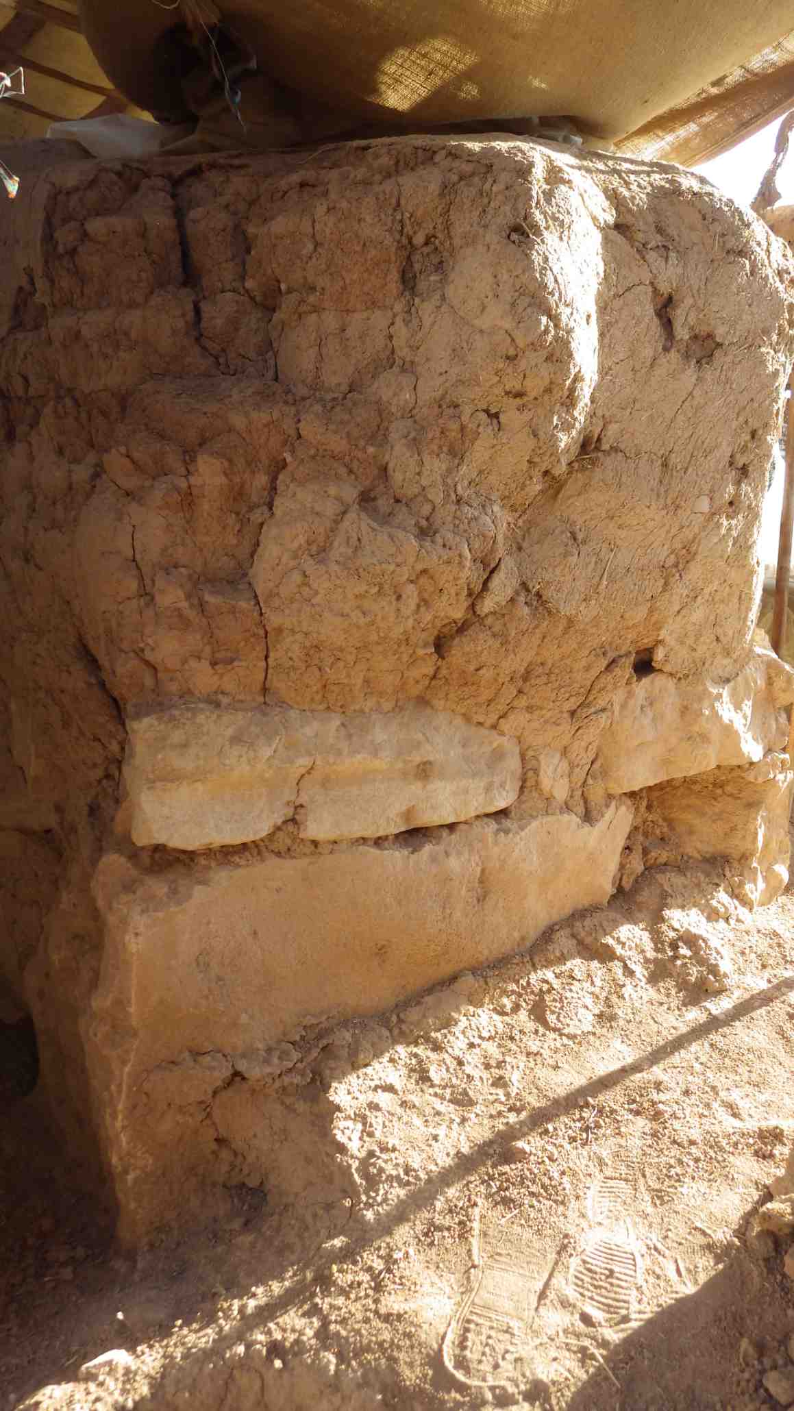 No loss in stones, mud bricks or mortar, but the mud plaster has peeled off in some spots. The wall has slightly eroded in the top left part.