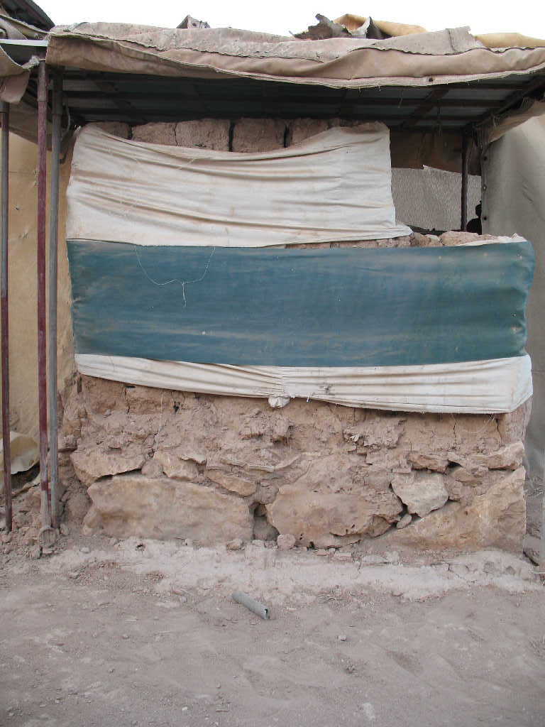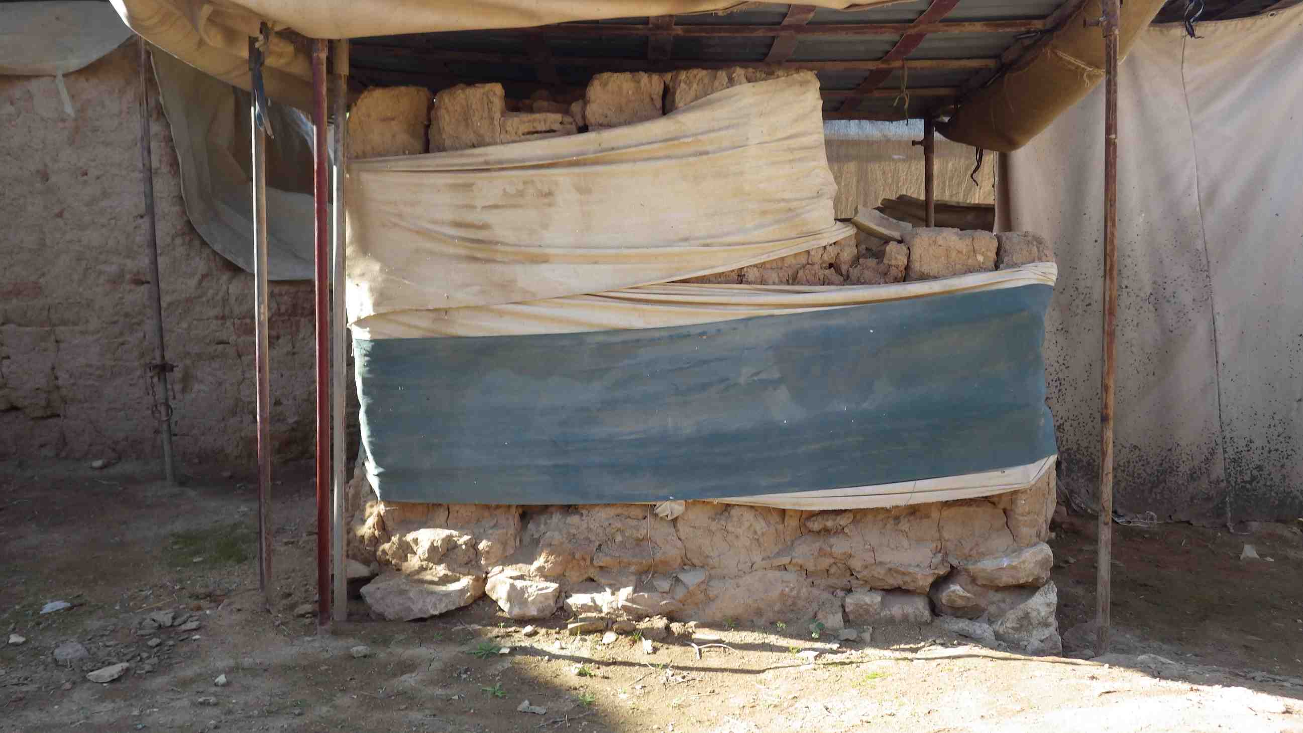 Hard to know the condition because the wall completely covered and wrapped with tent fabric due to its fragile state.