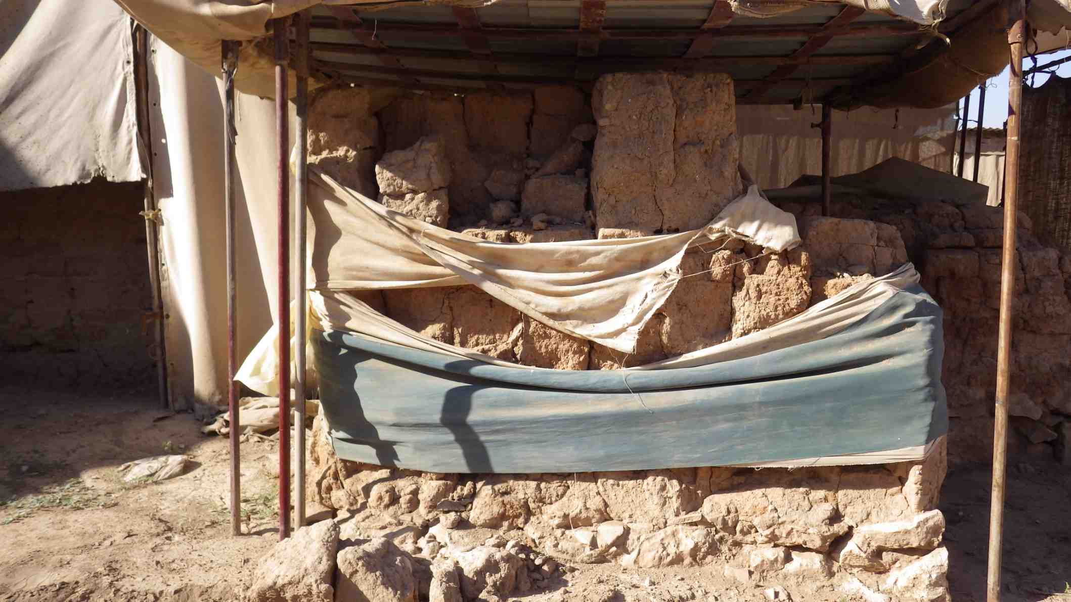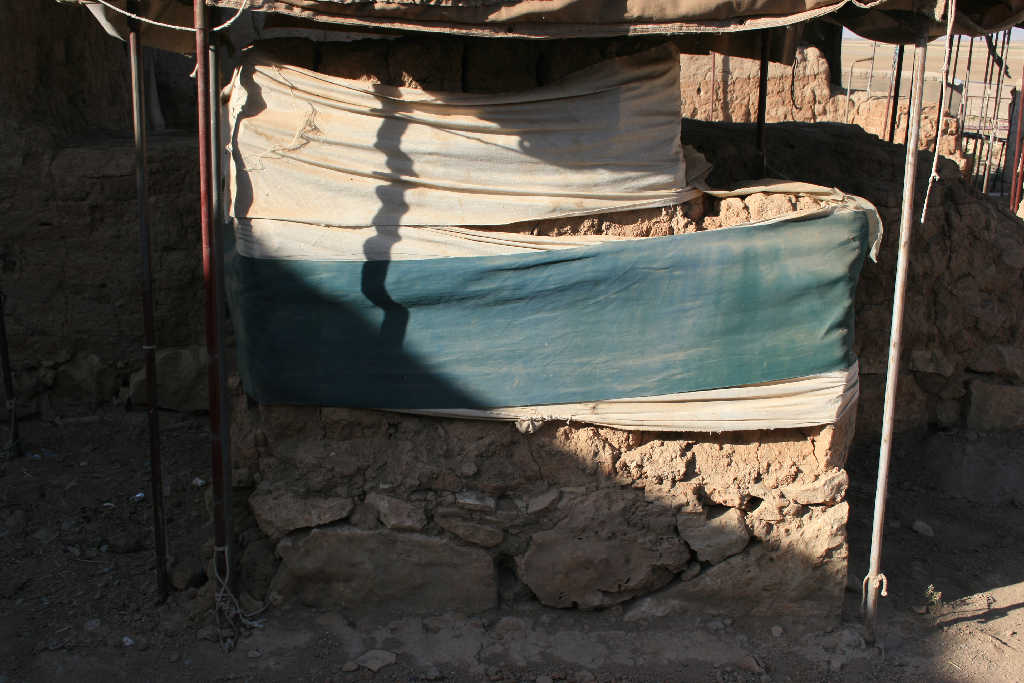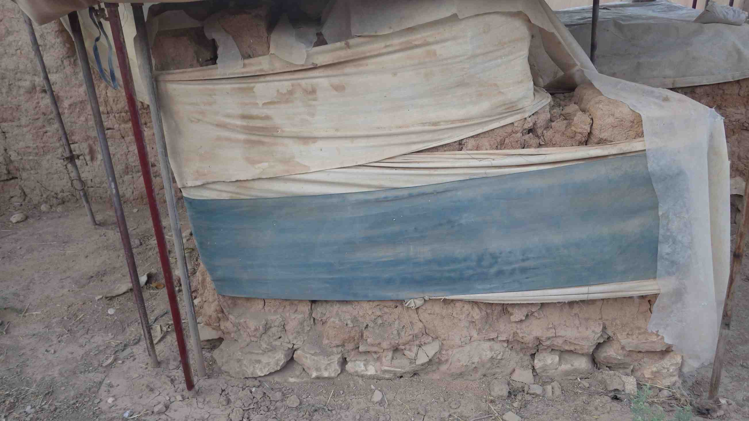The wrapping of the wall has been torn, and we can clearly see that the top part of the mudbrick layer has eroded. Some damages appear on the surface of the face of the wall as well.